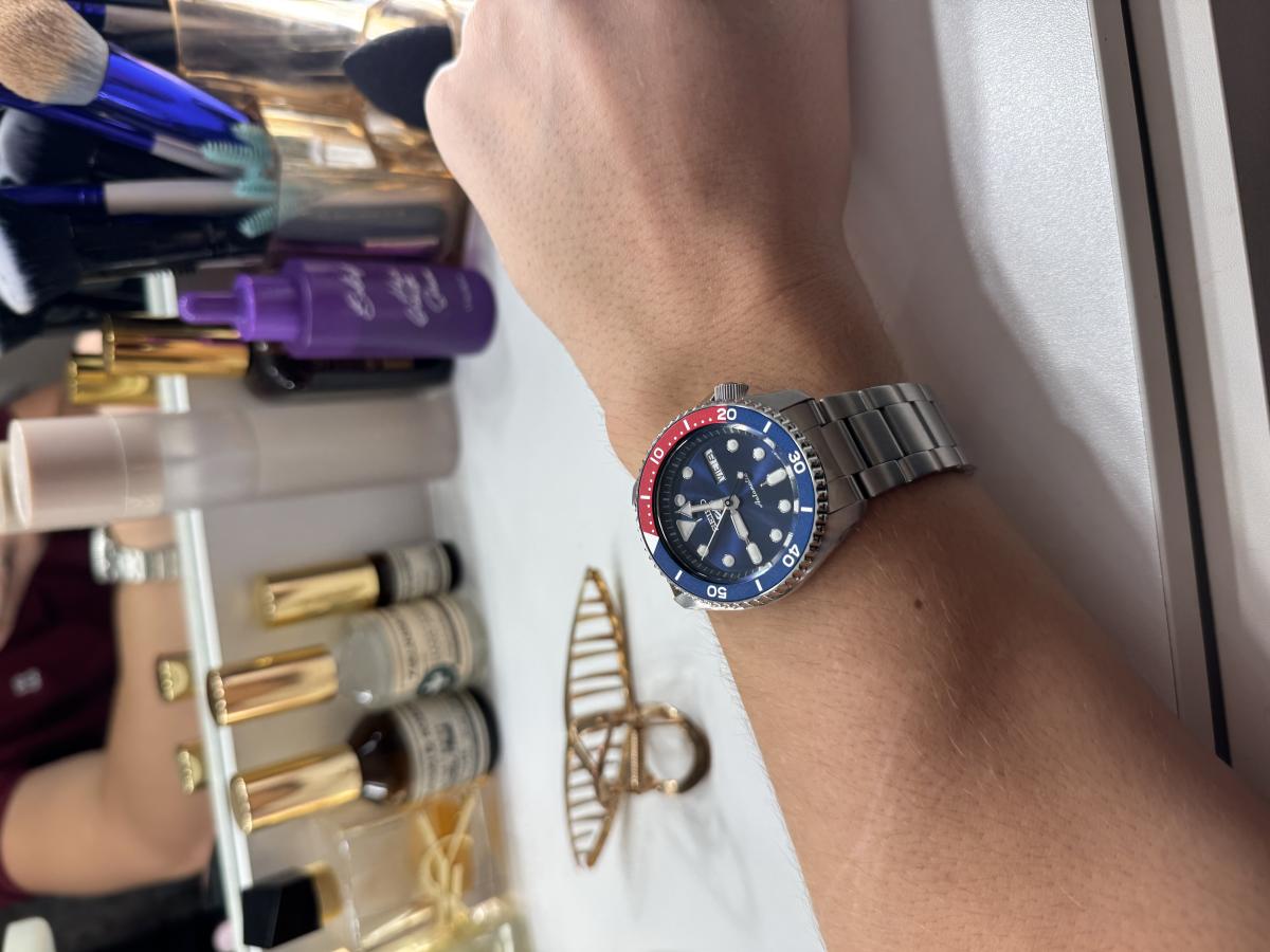 Модель имеет узнаваемую расцветку «Pepsi», оригинальный дизайн делает её запоминающейся деталью образа. Наручные часы с автоматической системой завода оснащены японским механизмом Seiko 4R36, имеющим 41-часовой резерв хода. Работа механизма прослеживается сквозь прозрачную заднюю крышку. Для изготовления корпуса и браслета использована хирургическая сталь 316L. Прочное минеральное стекло Hardlex устойчиво к царапинам. Задняя крышка завинчивается, закручивающаяся заводная головка оснащена системой защиты. Стрелки и метки имеют люминесцентное покрытиеЛюминесцентное покрытиеПозволяет считывать показания времени в темноте. Производители наносят на стрелки, часовые индексы, безель или поверхность циферблата светонакопительный состав, дающий холодное свечение.. БезельБезельВнешний ободок, закрепляющий стекло. В спортивных часах так называется поворотное кольцо с делениями на циферблате, выполняет роль таймера – замеряет отрезки времени на шкале. Неподвижный безель – элемент декора. Однонаправленно вращающийся безель на дайверских часах позволяет фиксировать моменты погружения и выныривания на поверхность. с PVD-покрытиемPVDУльтратонкое покрытие наносится в технике вакуумного напыления, сочетает в себе нитрид титана особой прочности со слоем золота или оксида хрома. Несёт в себе декоративную или защитную функцию.. Водостойкость 100 метров позволяет плавать в часах. Функции: отображение числа и дня недели, stop-second. Диаметр корпуса: 42,5 мм.