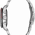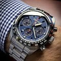 Seiko Prospex Speedtimer SSC815 — это элегантный солнечный хронограф, вдохновлённый первым хронографом Seiko, представленным на Олимпийских играх 1964 года в Токио. Модель сочетает в себе точность кварцевого механизма и экологичное питание от света благодаря технологии Tough SolarTough SolarТехнология основана на подзарядке аккумулятора от источника солнечного света, специальная панель улавливает солнечные лучи и преобразует их в энергию для работы часов. Достаточно пары минут нахождения на солнце для функционирования часов в течении суток., обеспечивая запас хода до 6 месяцев при полной зарядке. Также реализована функция предотвращения перезарядкиEOLПредставляет собой систему, уведомляющую владельца часов о необходимости замены элемента питания. За 2 недели до полного разряда батарейки секундная стрелка перестаёт ходить чётко и начинает перепрыгивать на 3-4 деления.. Часы оснащены калибром V192 с функцией отображения второго часового пояса в 12- и 24-часовом формате, а также хронографом с измерением времени до 60 минут с точностью до 1/5 секунды. Секундная стрелка вынесена на отдельный циферблат, что делает модель визуально сбалансированной и функциональной. На циферблате также присутствует тахиметрТахиметрРазмеченная шкала, располагается на ободке или безеле часов. Тахиметр позволяет рассчитать скорость на определённом участке пути, расстояние измеряется в километрах или милях. и ретроградный индикатор уровня заряда аккумулятора. Циферблат синего цвета дополнен штриховыми метками и стрелками с фирменным люминесцентным покрытиемЛюминесцентное покрытиеПозволяет считывать показания времени в темноте. Производители наносят на стрелки, часовые индексы, безель или поверхность циферблата светонакопительный состав, дающий холодное свечение. LumiBrite, обеспечивающим отличную читаемость даже в темноте. Защиту циферблата обеспечивает сапфировое стеклоСапфировое стеклоПрочный и надёжный материал из кристалла сапфира синтетического происхождения, характеризующийся особой твёрдостью и устойчивостью к царапинам и повреждениям. с выпуклой формой и антибликовым покрытием на внутренней поверхности. Корпус диаметром 39 мм изготовлен из стали с частичным PVD-покрытиемPVDУльтратонкое покрытие наносится в технике вакуумного напыления, сочетает в себе нитрид титана особой прочности со слоем золота или оксида хрома. Несёт в себе декоративную или защитную функцию., а задняя крышка — завинчивающаяся, с выгравированным серийным номером. Часы водонепроницаемы до 100 метров (), что позволяет использовать их при плавании и других водных активностях. Браслет выполнен из стали и оснащён трёхсгибной раскладной застёжкойРаскладная застёжкаТакой тип застёжки используется только на браслетах из металла. Она никогда не раскрывается полностью, происходит разделение на 2 и более частей. Раскладывающая застёжка снизит вероятность потери часов к минимуму. с кнопочным механизмом, обеспечивающей комфорт и уверенную фиксацию на запястье. Ширина браслета составляет 22 мм, что делает его совместимым со стандартными размерами. Эти часы станут универсальным аксессуаром для тех, кто ценит сочетание технологичности, истории и эстетики — идеальный выбор как для повседневной носки, так и для особых случаев.