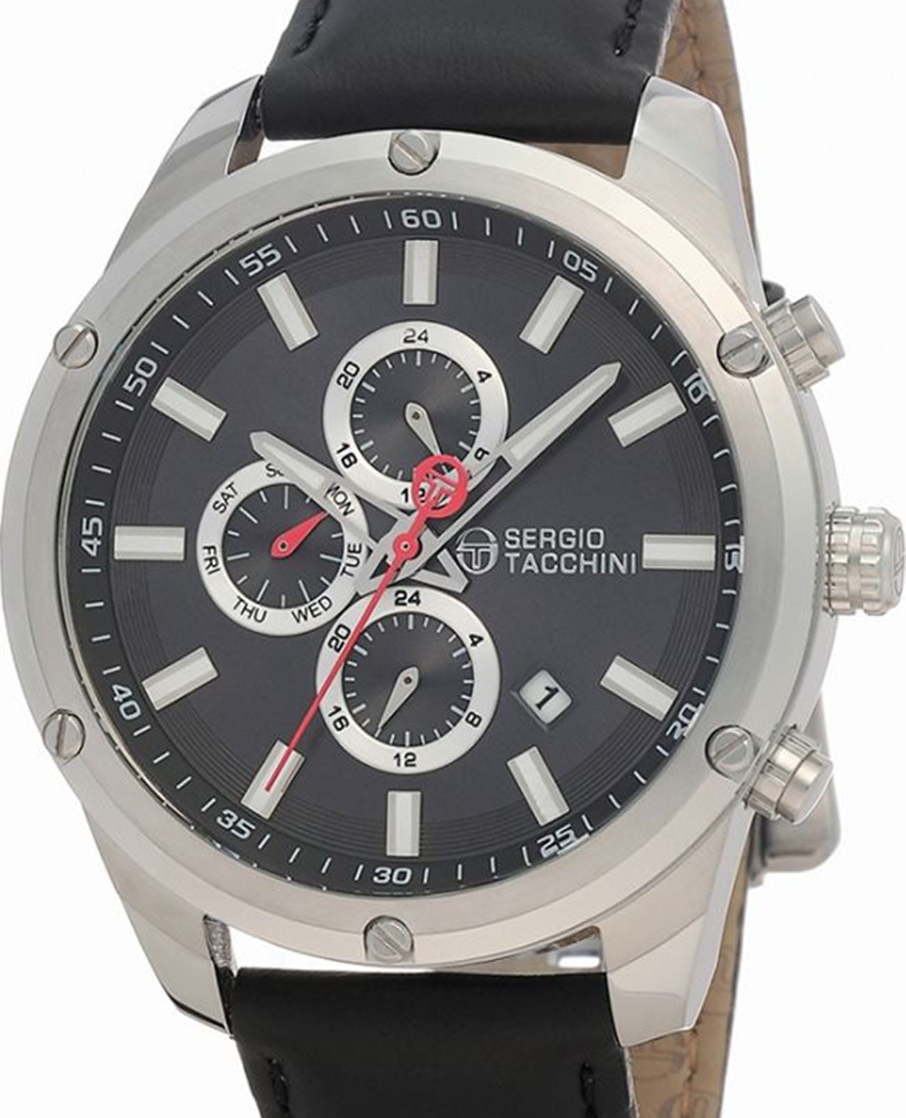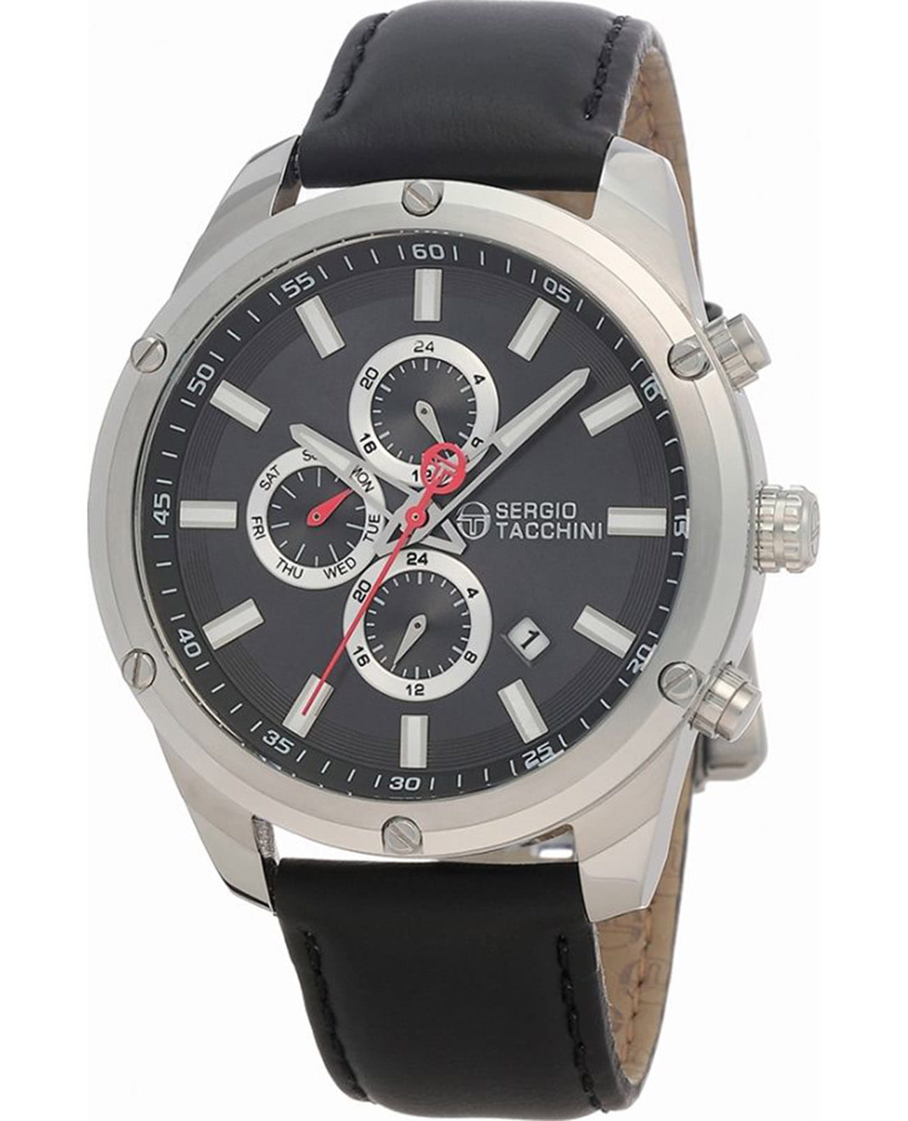 Мужские кварцевые часы Sergio Tacchini из коллекции Archivio — это сочетание классического стиля и современной функциональности. Корпус диаметром 46 мм выполнен из нержавеющей стали 316L. Циферблат чёрного цвета оформлен индексами и стрелками. Указатели дня недели, даты и второго часового пояса в 24-часовом формате вынесены на отдельные субциферблаты. Стрелки с люминесцентным покрытиемЛюминесцентное покрытиеПозволяет считывать показания времени в темноте. Производители наносят на стрелки, часовые индексы, безель или поверхность циферблата светонакопительный состав, дающий холодное свечение., обеспечивающим хорошую читаемость в темноте. Циферблат защищён минеральным стекломМинеральное стеклоМинеральное стекло представляет собой искусственно выращенный минерал кварца. Такое стекло отличается особой устойчивостью к повреждениям и царапинам. Уступает по некоторым качествам сапфировому стеклу.. Часы оснащены кожаным ремешком чёрного цвета с раскладной застёжкойРаскладная застёжкаТакой тип застёжки используется только на браслетах из металла. Она никогда не раскрывается полностью, происходит разделение на 2 и более частей. Раскладывающая застёжка снизит вероятность потери часов к минимуму.. Водонепроницаемость 50 м позволяет использовать часы в повседневных условиях. Идеальный выбор для тех, кто ценит стиль и практичность.