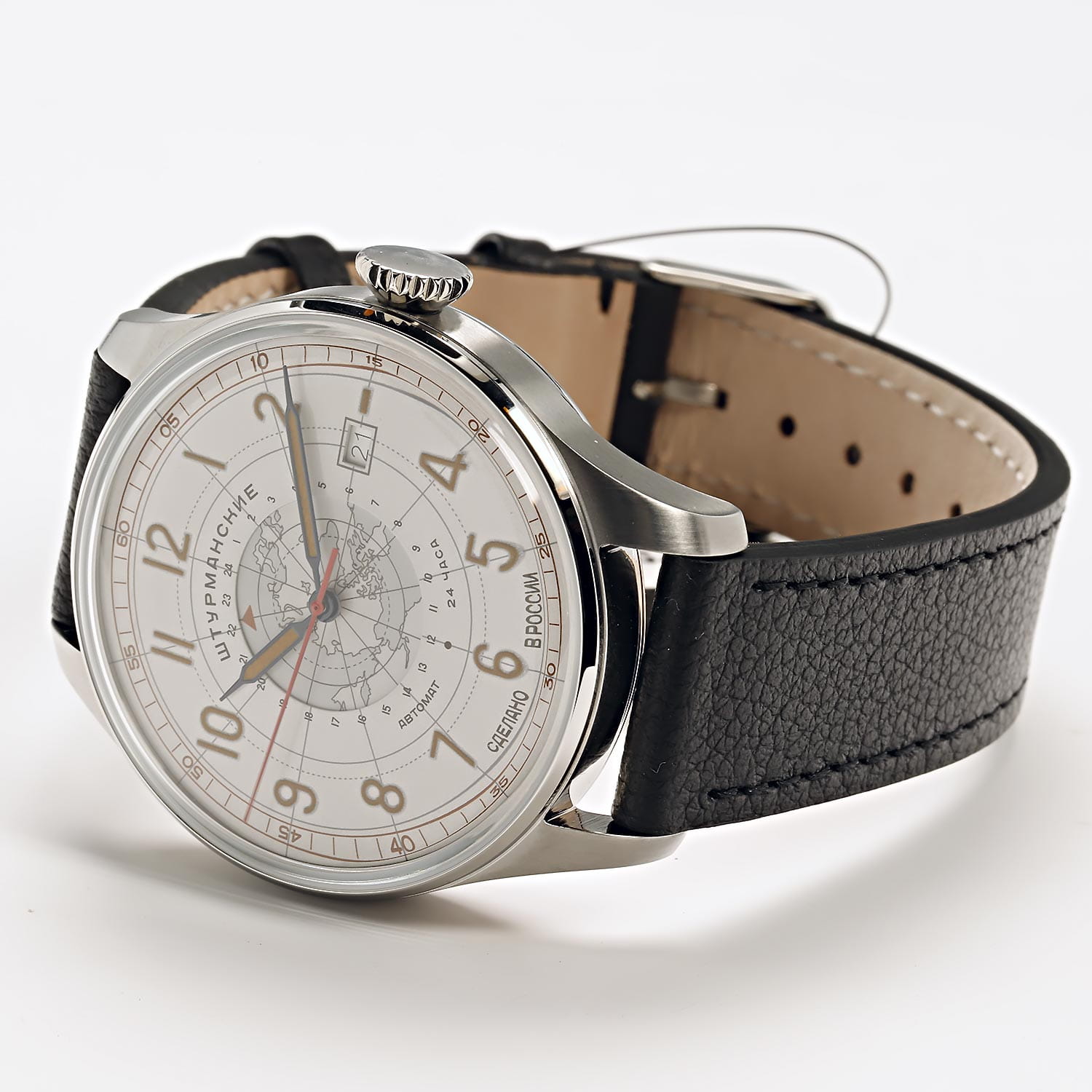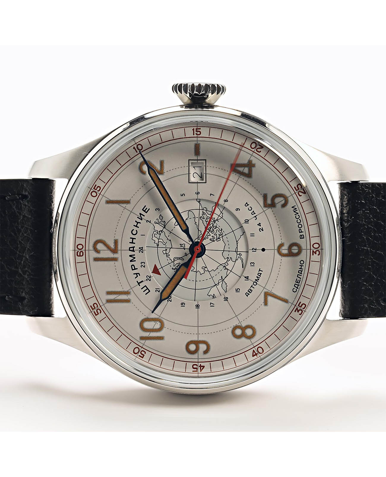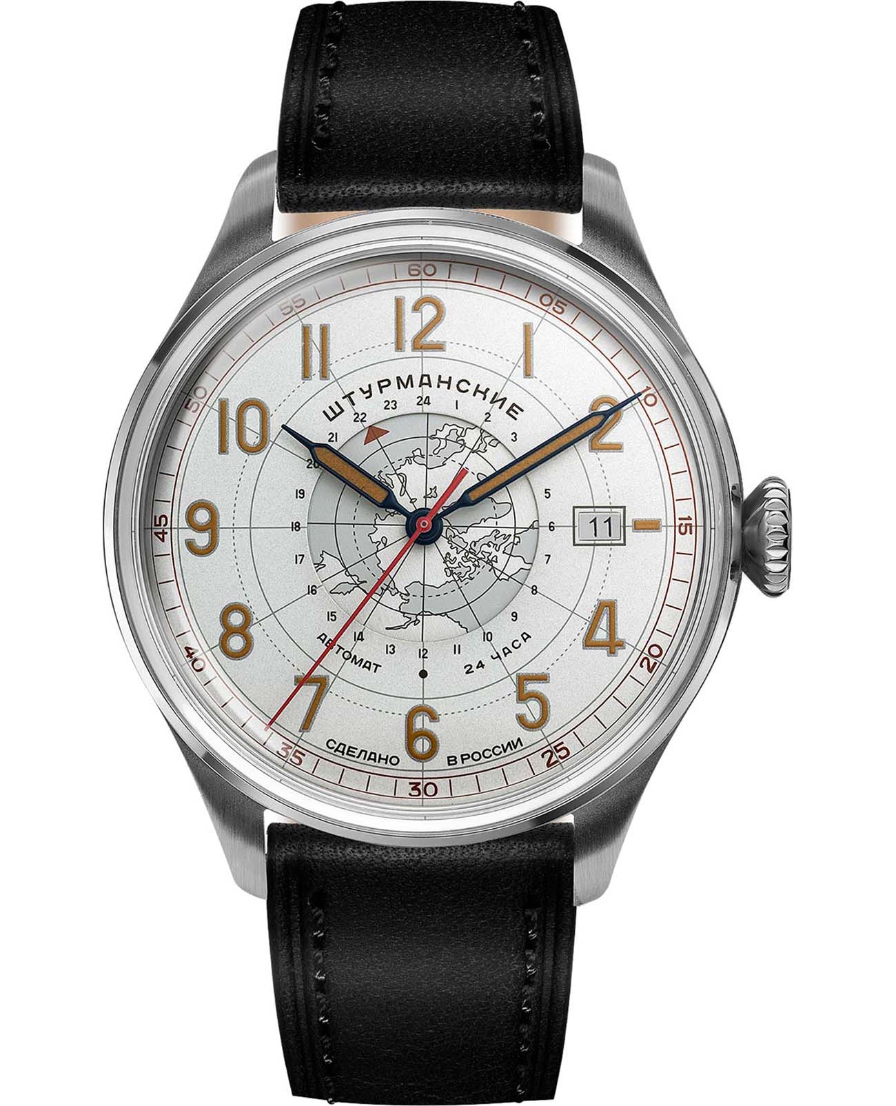 Штурманские мужские российские механические часы с механизмом высокой точности. Класс водозащиты: 30 метров, позволит защитить корпус от случайных брызг или капель дождя. Корпус часов изготовлен из стали. Органическое стекло устойчивое к мелким механическим повреждениям.Кожаный ремешок на стандартной застёжке. Стрелки и метки с люминесцентным покрытиемЛюминесцентное покрытиеПозволяет считывать показания времени в темноте. Производители наносят на стрелки, часовые индексы, безель или поверхность циферблата светонакопительный состав, дающий холодное свечение.. Окошко даты находится в положении 3 часа. Задняя крышка украшена картой Арктики.
