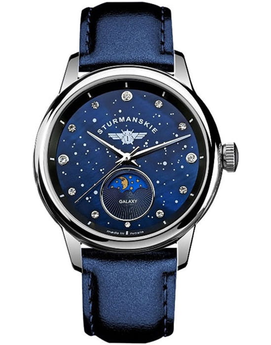 Женские российские кварцевые часы Штурманские 9231/5361192, с высокой точностью. Минеральное стеклоМинеральное стеклоМинеральное стекло представляет собой искусственно выращенный минерал кварца. Такое стекло отличается особой устойчивостью к повреждениям и царапинам. Уступает по некоторым качествам сапфировому стеклу. устойчивое к мелким механическим повреждениям. Класс водозащиты: 30 метров, позволит защитить корпус от случайных брызг или капель дождя. Корпус часов изготовлен из стали. Кожаный ремешок на стандартной застёжке. Чёткая, читаемая минутная шкала уходит за приделы видимой области циферблата, подчёркивая изящность ободка корпуса. Стрелки и метки с люминесцентным покрытиемЛюминесцентное покрытиеПозволяет считывать показания времени в темноте. Производители наносят на стрелки, часовые индексы, безель или поверхность циферблата светонакопительный состав, дающий холодное свечение.. В положении 6 часов календарь фаз луны.