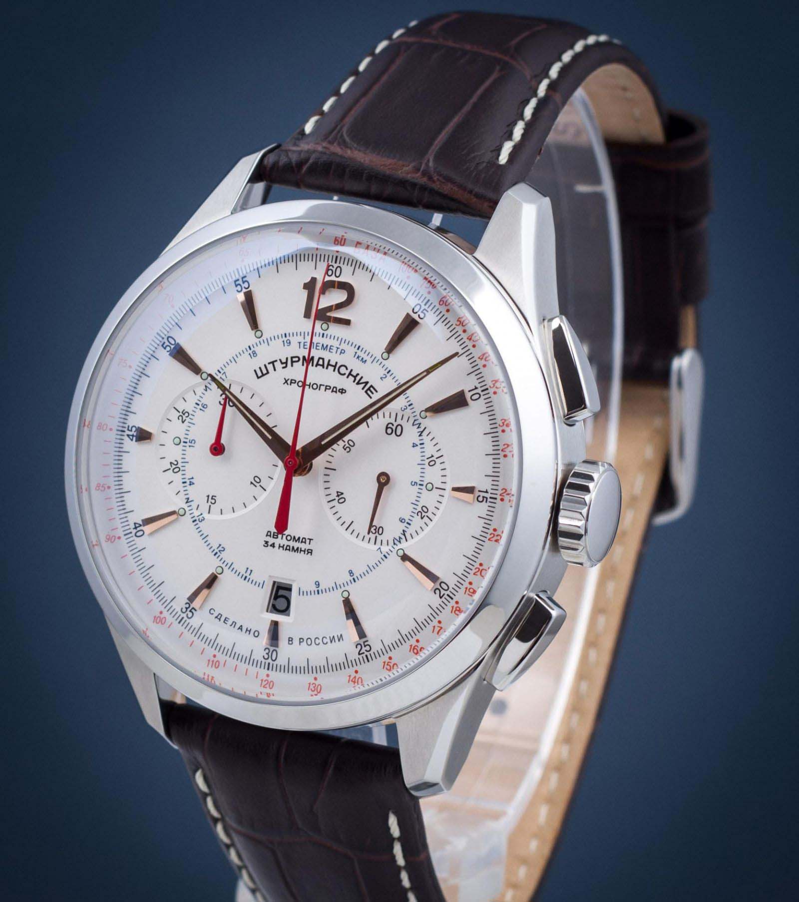 Мужские российские механические часы-хронографХронографФункция позволяет измерять отрезки времени с особой точностью: часы, минуты, секунды. Верным признаком хронографа является наличие на циферблате 3 дополнительных окошек-счётчиков. с секундомеромСекундомерСекундоме́р — прибор, способный измерять интервалы времени с точностью до долей секунды. Штурманские Открытый Космос NE86/1855018, механический механизм (автоматический калибр) с высокой точностью. Лимитированная серия - 500 экземпляров, посвящена первому выходу человека в открытый космос. Индивидуальная нумерация. Сапфировое стеклоСапфировое стеклоПрочный и надёжный материал из кристалла сапфира синтетического происхождения, характеризующийся особой твёрдостью и устойчивостью к царапинам и повреждениям. устойчивое к появлению царапин, обладающее высокой прозрачностью. Класс водозащиты: 50 метров, позволит защитить корпус от случайных брызг или капель дождя. Корпус часов изготовлен из стали. Кожаный ремешок на стандартной застёжке. Стрелки и метки с люминесцентным покрытиемЛюминесцентное покрытиеПозволяет считывать показания времени в темноте. Производители наносят на стрелки, часовые индексы, безель или поверхность циферблата светонакопительный состав, дающий холодное свечение.. Стальной корпус надежно защищает от повреждений механический японский калибр Seiko NE86 на 34 камня с запасом хода 42 часа. Подзавод у часов автоматический.