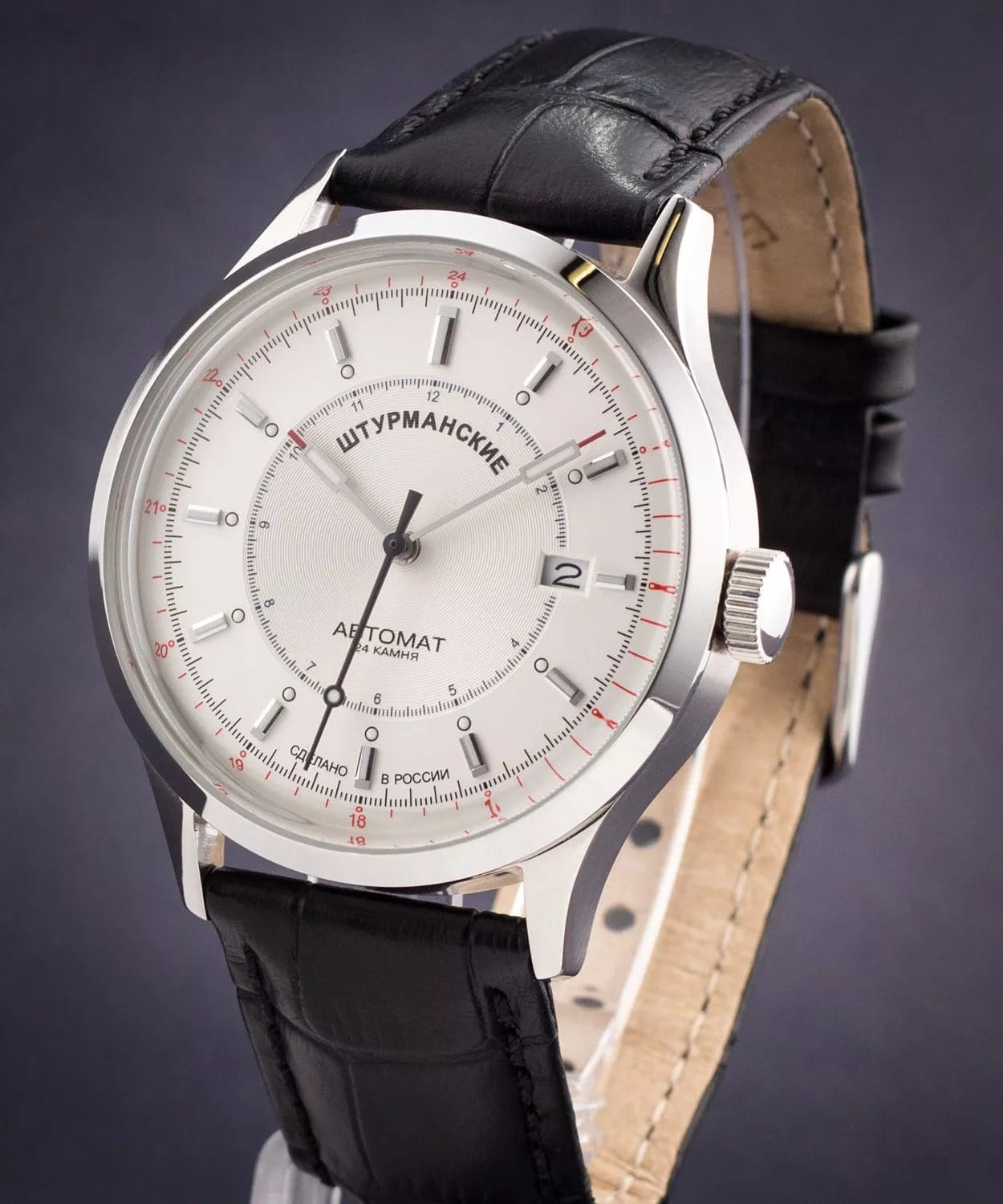 Мужские российские механические часы Штурманские NH35/1811871, механический механизм (автоматический калибр) с высокой точностью. Минеральное стеклоМинеральное стеклоМинеральное стекло представляет собой искусственно выращенный минерал кварца. Такое стекло отличается особой устойчивостью к повреждениям и царапинам. Уступает по некоторым качествам сапфировому стеклу. устойчивое к мелким механическим повреждениям. Класс водозащиты: 50 метров, позволит защитить корпус от случайных брызг или капель дождя. Корпус часов изготовлен из стали. Кожаный ремешок на стандартной застёжке. Чёткая, читаемая минутная шкала уходит за приделы видимой области циферблата, подчёркивая изящность ободка корпуса. Стрелки и метки с люминесцентным покрытиемЛюминесцентное покрытиеПозволяет считывать показания времени в темноте. Производители наносят на стрелки, часовые индексы, безель или поверхность циферблата светонакопительный состав, дающий холодное свечение..