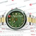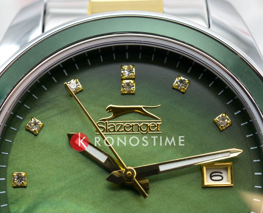 Женские наручные часы Slazenger SL.09.2142.3.03 сочетают в себе элегантный дизайн и надежность современных технологий. Модель обладает корпусом размерами 37 мм, изготовленным из суперметалла, что обеспечивает высокую устойчивость к внешним воздействиям. БезельБезельВнешний ободок, закрепляющий стекло. В спортивных часах так называется поворотное кольцо с делениями на циферблате, выполняет роль таймера – замеряет отрезки времени на шкале. Неподвижный безель – элемент декора. Однонаправленно вращающийся безель на дайверских часах позволяет фиксировать моменты погружения и выныривания на поверхность. с IP-покрытиемIP-покрытиеМетод ионного напыления. Демонстрирует повышенную устойчивость к истиранию, окислению и химическим веществам. Под воздействием высокого давления и температуры около 1500°C молекулы металла надёжно соединяются с частицами корпуса часов.. Браслет из суперметалла с частичным IP-покрытиемIP-покрытиеМетод ионного напыления. Демонстрирует повышенную устойчивость к истиранию, окислению и химическим веществам. Под воздействием высокого давления и температуры около 1500°C молекулы металла надёжно соединяются с частицами корпуса часов. гарантирует комфортное ношение и стильный внешний вид. Циферблат зеленого цвета декорирован кристаллами в виде меток. Для защиты используется минеральное стеклоМинеральное стеклоМинеральное стекло представляет собой искусственно выращенный минерал кварца. Такое стекло отличается особой устойчивостью к повреждениям и царапинам. Уступает по некоторым качествам сапфировому стеклу., обеспечивающее прочную защиту от царапин. Часы работают на кварцевом механизме, поэтому гарантирует точное время без необходимости подзаводки. Модель также оснащена функцией отображения даты, делая ее практичной для повседневного использования. Водонепроницаемость часов достигает 3 атмосфер, что позволяет использовать их при мытье рук или хождении под мелким дождем, однако не рекомендуется для плавания или других водных видов спорта. Вес модели составляет 97 грамм.