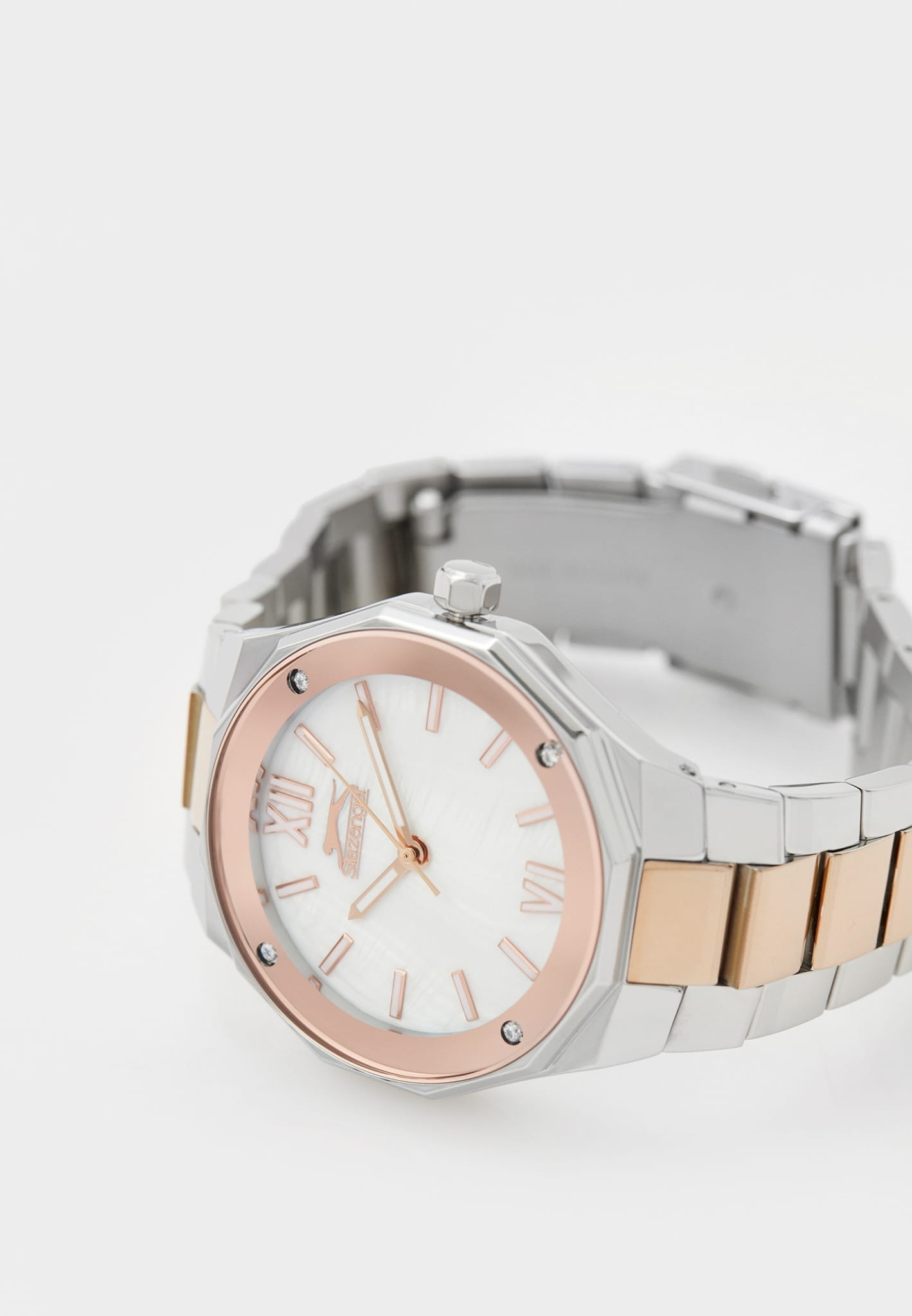 Часы Slazenger SL.09.2258.3.02 — это изысканный аксессуар, который гармонично подчеркнёт ваш индивидуальный стиль. Корпус и браслет выполнены из инновационного суперметалла — сплава на основе меди с пониженным содержанием цинка и никеля, обладающего специальным защитным покрытием, а циферблат украшен 4 кристаллами. Надёжный кварцевый механизм обеспечивает точный ход, а прочное минеральное стеклоМинеральное стеклоМинеральное стекло представляет собой искусственно выращенный минерал кварца. Такое стекло отличается особой устойчивостью к повреждениям и царапинам. Уступает по некоторым качествам сапфировому стеклу. устойчиво к царапинам и защищает перламутровый циферблат от внешних воздействий. Диаметр корпуса составляет 38 мм, толщина — всего 8 мм, что делает модель элегантной и удобной для ежедневного ношения. Водонепроницаемость до 3 бар позволяет не беспокоиться о случайных брызгах или каплях дождя. Стрелки с люминесцентным покрытиемЛюминесцентное покрытиеПозволяет считывать показания времени в темноте. Производители наносят на стрелки, часовые индексы, безель или поверхность циферблата светонакопительный состав, дающий холодное свечение. удобно подсвечиваются в темноте после зарядки на свету. Стальной браслет с частичным розово-золотистым IP-покрытиемIP-покрытиеМетод ионного напыления. Демонстрирует повышенную устойчивость к истиранию, окислению и химическим веществам. Под воздействием высокого давления и температуры около 1500°C молекулы металла надёжно соединяются с частицами корпуса часов. и раскладной застёжкойРаскладная застёжкаТакой тип застёжки используется только на браслетах из металла. Она никогда не раскрывается полностью, происходит разделение на 2 и более частей. Раскладывающая застёжка снизит вероятность потери часов к минимуму. обеспечивает комфортную посадку. Часы станут отличным выбором как для повседневной жизни, так и для особых случаев, а также послужат прекрасным подарком на любой праздник.