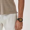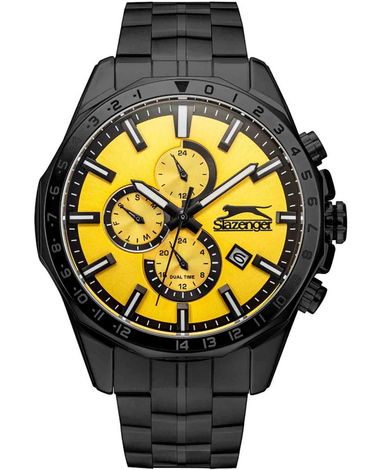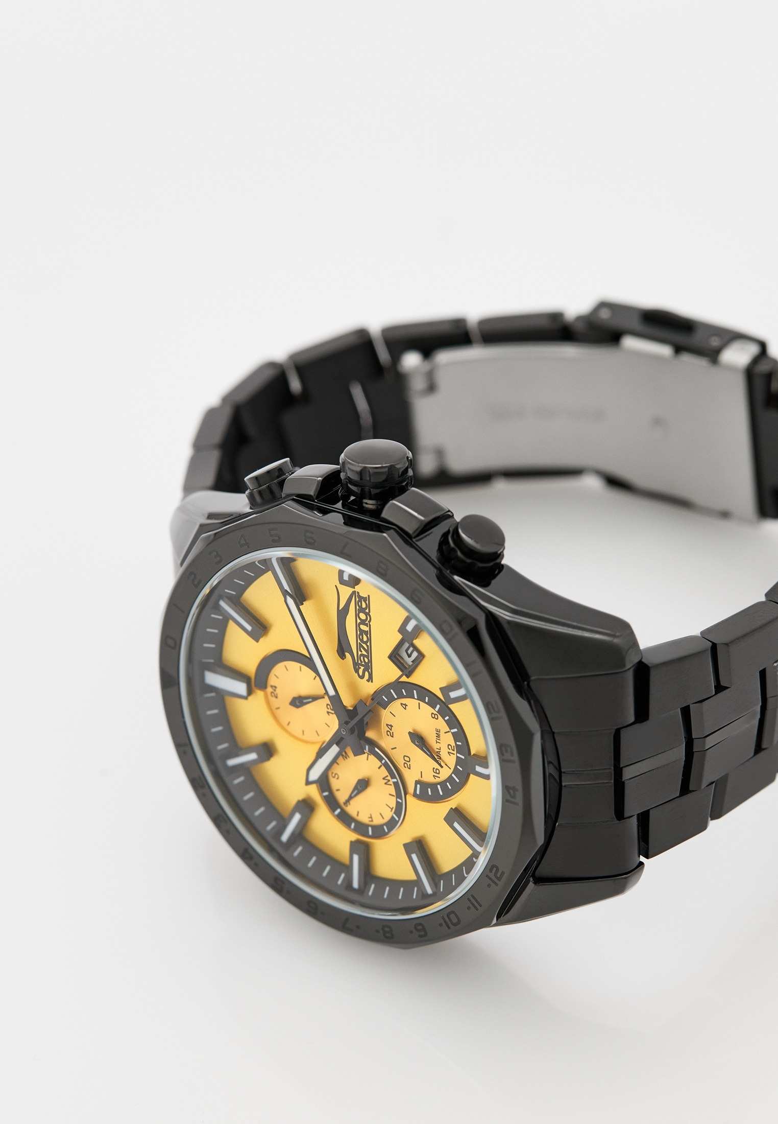 Часы Slazenger SL.09.2259.2.06 — это стильный и многофункциональный аксессуар, который станет достойным дополнением к вашему образу. Корпус и браслет модели выполнены из современного суперметалла с черным IP-покрытиеIP-покрытиеМетод ионного напыления. Демонстрирует повышенную устойчивость к истиранию, окислению и химическим веществам. Под воздействием высокого давления и температуры около 1500°C молекулы металла надёжно соединяются с частицами корпуса часов. — прочного сплава на основе меди с пониженным содержанием цинка и никеля, а также инновационным покрытием, что обеспечивает долговечность и привлекательный внешний вид. На безельБезельВнешний ободок, закрепляющий стекло. В спортивных часах так называется поворотное кольцо с делениями на циферблате, выполняет роль таймера – замеряет отрезки времени на шкале. Неподвижный безель – элемент декора. Однонаправленно вращающийся безель на дайверских часах позволяет фиксировать моменты погружения и выныривания на поверхность. нанесено также черное IP-покрытиеIP-покрытиеМетод ионного напыления. Демонстрирует повышенную устойчивость к истиранию, окислению и химическим веществам. Под воздействием высокого давления и температуры около 1500°C молекулы металла надёжно соединяются с частицами корпуса часов., что придает аксессуару утончённый и универсальный внешний вид. Под минеральным стекломМинеральное стеклоМинеральное стекло представляет собой искусственно выращенный минерал кварца. Такое стекло отличается особой устойчивостью к повреждениям и царапинам. Уступает по некоторым качествам сапфировому стеклу. находится желтый циферблат с дополнительными функциями: вынесенный 24-часовой индикатор, указатель дня недели, окно даты в положении между 4 и 5 часами, а также функция GMTGMTОтображение времени второго часового пояса.Такая функция особенно актуальна для путешественников и бизнесменов,которые общаются с людьми из разных стран,теперь вы всегда будете знать,какой час у вашего партнёра или близкого человека. для отслеживания второго часового поясаВторой часовой поясФункция, позволяющая отображать время двух часовых поясов одновременно. — всё это делает модель особенно удобной при активном образе жизни и путешествиях. Кварцевый механизм гарантирует высокую точность хода. Диаметр корпуса составляет 46 мм, толщина — 12 мм, что подчёркивает современный характер часов. Стрелки с люминесцентным покрытиемЛюминесцентное покрытиеПозволяет считывать показания времени в темноте. Производители наносят на стрелки, часовые индексы, безель или поверхность циферблата светонакопительный состав, дающий холодное свечение. удобно подсвечиваются в темноте после зарядки на свету. Стальной браслет с раскладной застёжкойРаскладная застёжкаТакой тип застёжки используется только на браслетах из металла. Она никогда не раскрывается полностью, происходит разделение на 2 и более частей. Раскладывающая застёжка снизит вероятность потери часов к минимуму. обеспечивает комфортную посадку. Водозащита до 5 атмосфер позволяет не опасаться случайных брызг или дождя. Часы идеально подходят для ежедневного ношения и особых случаев, а также станут отличным подарком.