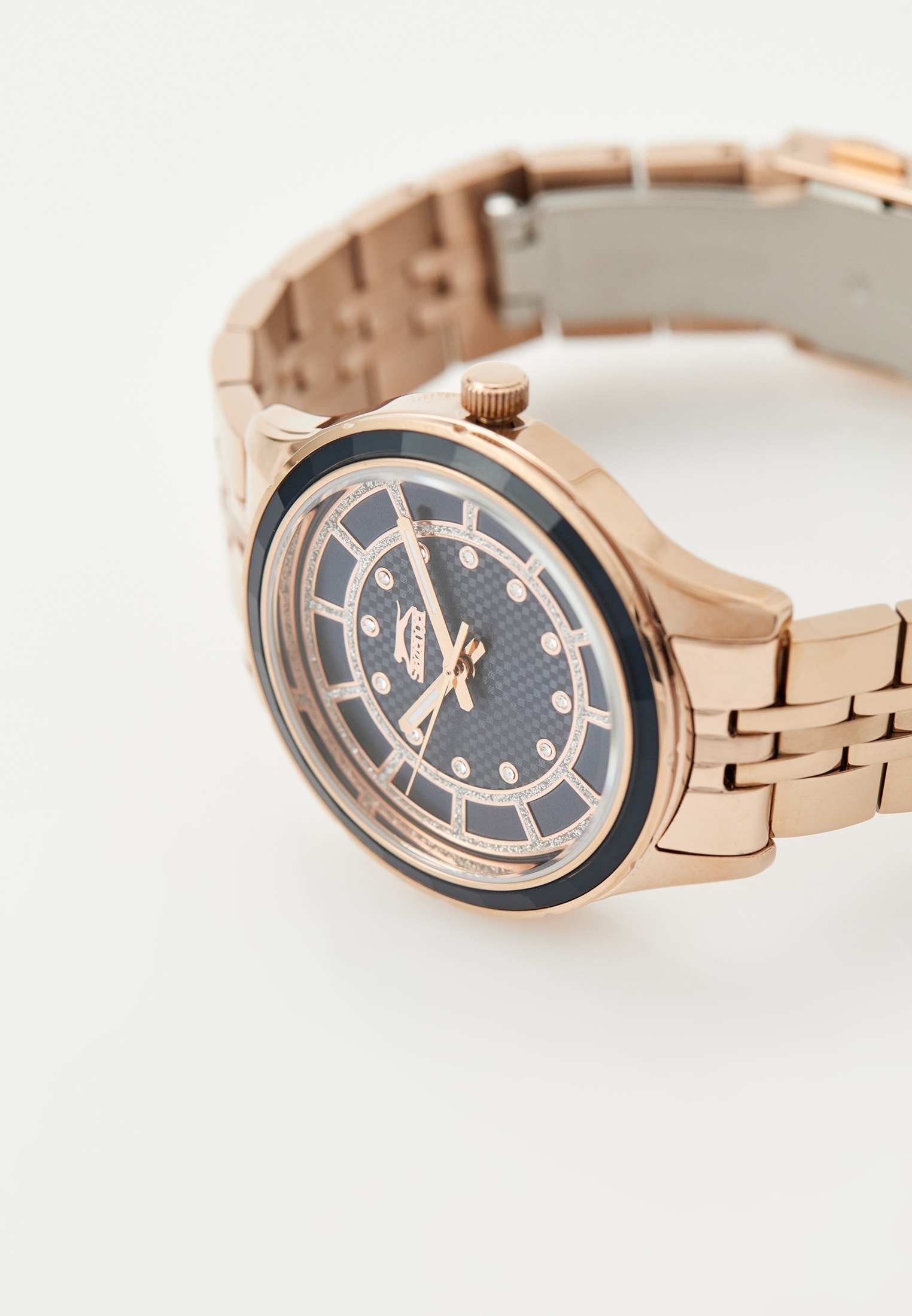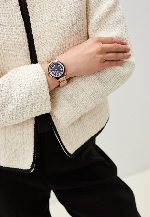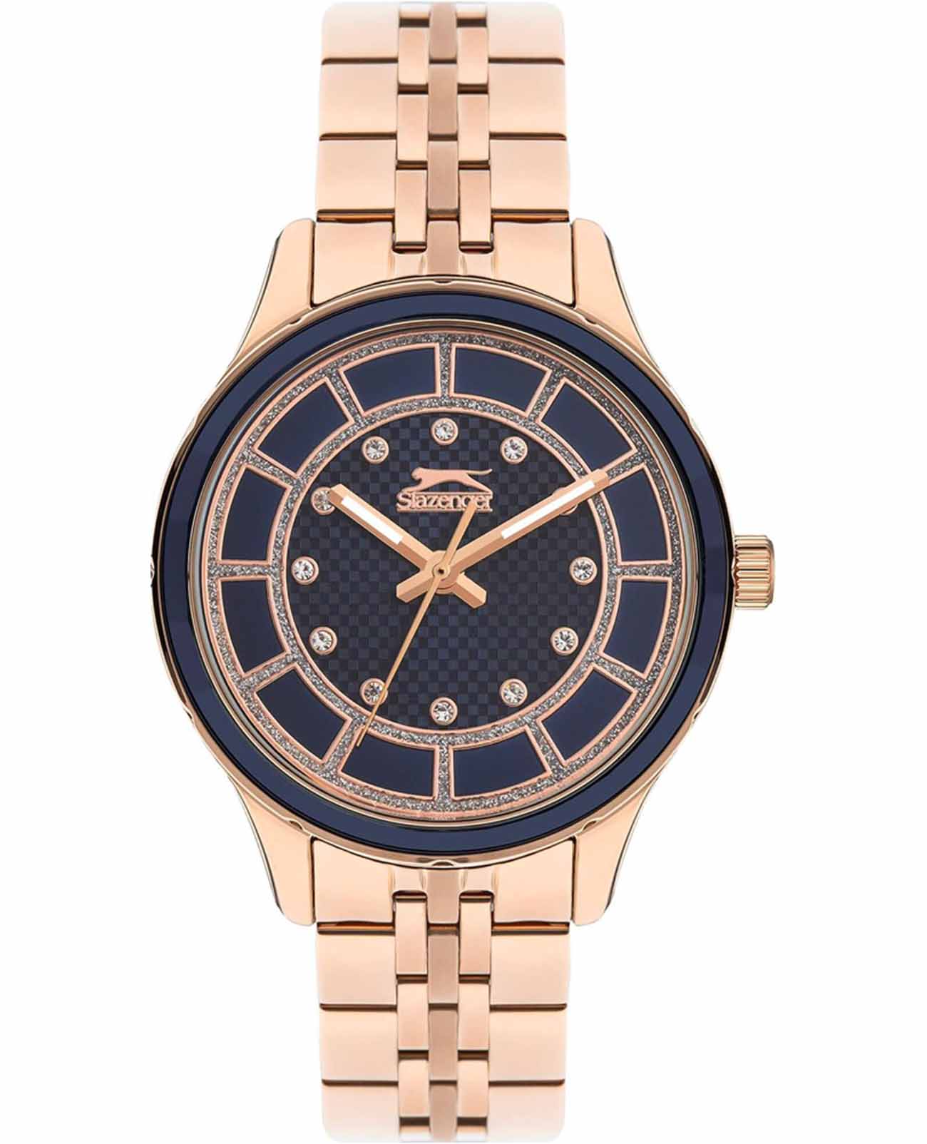 Женские наручные часы Slazenger SL.09.2295.3.05 — это элегантный аксессуар, который подчеркнет утончённый стиль своей обладательницы. Корпус диаметром 36 мм и толщиной 11,5 мм выполнен из прочного металла с розово-золотистым IP-покрытиемIP-покрытиеМетод ионного напыления. Демонстрирует повышенную устойчивость к истиранию, окислению и химическим веществам. Под воздействием высокого давления и температуры около 1500°C молекулы металла надёжно соединяются с частицами корпуса часов. и надёжно защищён минеральным стекломМинеральное стеклоМинеральное стекло представляет собой искусственно выращенный минерал кварца. Такое стекло отличается особой устойчивостью к повреждениям и царапинам. Уступает по некоторым качествам сапфировому стеклу., устойчивым к царапинам. Синий циферблат украшен изящными кристаллами, придающими часам особый блеск и изысканность. Модель оснащена люминесцентным покрытиемЛюминесцентное покрытиеПозволяет считывать показания времени в темноте. Производители наносят на стрелки, часовые индексы, безель или поверхность циферблата светонакопительный состав, дающий холодное свечение. стрелок, что облегчает считывание времени в темноте. Особое внимание привлекает безельБезельВнешний ободок, закрепляющий стекло. В спортивных часах так называется поворотное кольцо с делениями на циферблате, выполняет роль таймера – замеряет отрезки времени на шкале. Неподвижный безель – элемент декора. Однонаправленно вращающийся безель на дайверских часах позволяет фиксировать моменты погружения и выныривания на поверхность. с синим IP-покрытиемIP-покрытиеМетод ионного напыления. Демонстрирует повышенную устойчивость к истиранию, окислению и химическим веществам. Под воздействием высокого давления и температуры около 1500°C молекулы металла надёжно соединяются с частицами корпуса часов.. Металлический браслет с розово-золотистым IP-покрытиемIP-покрытиеМетод ионного напыления. Демонстрирует повышенную устойчивость к истиранию, окислению и химическим веществам. Под воздействием высокого давления и температуры около 1500°C молекулы металла надёжно соединяются с частицами корпуса часов. шириной 16 мм оснащён удобной раскладной застёжкойРаскладная застёжкаТакой тип застёжки используется только на браслетах из металла. Она никогда не раскрывается полностью, происходит разделение на 2 и более частей. Раскладывающая застёжка снизит вероятность потери часов к минимуму. для комфортной посадки на запястье. Кварцевый механизм обеспечивает точность хода, а водозащита уровня WR 30 защищает часы от случайных брызг. Для удобства в условиях плохой освещённости предусмотрена подсветка стрелок. Вес изделия составляет 95 граммов.