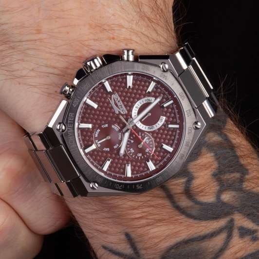 Мужские кварцевые часы Slazenger SL.09.2325.2.05 — это выразительный и функциональный аксессуар, сочетающий стиль, прочность и насыщенную комплектацию. Корпус и браслет выполнены из суперметалла, а циферблат оформлен в бордовых тонах. Циферблат защищён минеральным стекломМинеральное стеклоМинеральное стекло представляет собой искусственно выращенный минерал кварца. Такое стекло отличается особой устойчивостью к повреждениям и царапинам. Уступает по некоторым качествам сапфировому стеклу. и дополнен вынесенными малыми циферблатами для индикации дня недели, даты и времени в 24-часовом формате. БезельБезельВнешний ободок, закрепляющий стекло. В спортивных часах так называется поворотное кольцо с делениями на циферблате, выполняет роль таймера – замеряет отрезки времени на шкале. Неподвижный безель – элемент декора. Однонаправленно вращающийся безель на дайверских часах позволяет фиксировать моменты погружения и выныривания на поверхность. с IP-покрытиемIP-покрытиеМетод ионного напыления. Демонстрирует повышенную устойчивость к истиранию, окислению и химическим веществам. Под воздействием высокого давления и температуры около 1500°C молекулы металла надёжно соединяются с частицами корпуса часов. дополнен тахиметромТахиметрРазмеченная шкала, располагается на ободке или безеле часов. Тахиметр позволяет рассчитать скорость на определённом участке пути, расстояние измеряется в километрах или милях.. Стрелки и метки оснащены люминесцентным покрытиемЛюминесцентное покрытиеПозволяет считывать показания времени в темноте. Производители наносят на стрелки, часовые индексы, безель или поверхность циферблата светонакопительный состав, дающий холодное свечение., обеспечивающим хорошую читаемость в темноте. Браслет из суперметалла фиксируется на раскладной застёжкеРаскладная застёжкаТакой тип застёжки используется только на браслетах из металла. Она никогда не раскрывается полностью, происходит разделение на 2 и более частей. Раскладывающая застёжка снизит вероятность потери часов к минимуму., обеспечивая удобство и безопасность ношения. Водонепроницаемость 50 м позволяет использовать часы в повседневных условиях, защищая от случайных брызг и капель дождя. Модель подчёркивает индивидуальность владельца и идеально подходит как для повседневного, так и для делового образа.