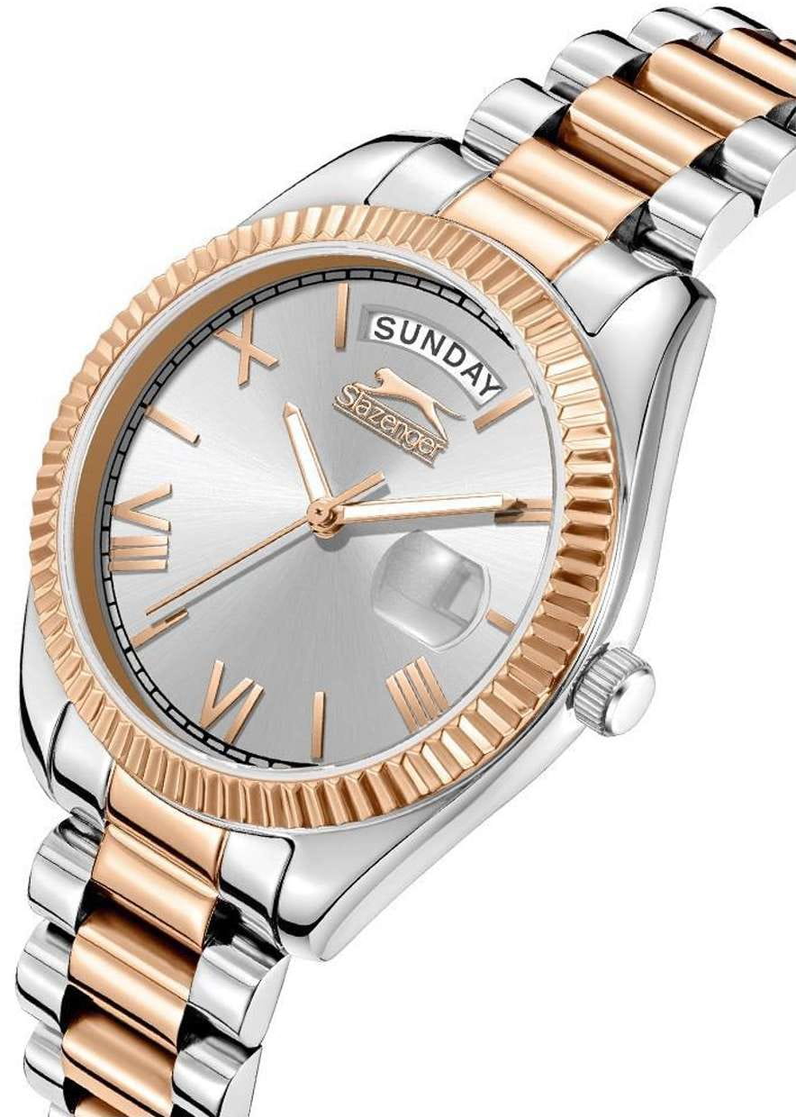 Женские элегантные наручные часы Slazenger SL.09.2338.4.02 сочетают в себе современный стиль и функциональность. Стильный корпус выполнен из суперметалла, а неповоротный безельБезельВнешний ободок, закрепляющий стекло. В спортивных часах так называется поворотное кольцо с делениями на циферблате, выполняет роль таймера – замеряет отрезки времени на шкале. Неподвижный безель – элемент декора. Однонаправленно вращающийся безель на дайверских часах позволяет фиксировать моменты погружения и выныривания на поверхность. с IP-покрытиемIP-покрытиеМетод ионного напыления. Демонстрирует повышенную устойчивость к истиранию, окислению и химическим веществам. Под воздействием высокого давления и температуры около 1500°C молекулы металла надёжно соединяются с частицами корпуса часов., придающий модели дополнительную прочность и элегантный внешний вид. Изысканный циферблат защищён минеральным стекломМинеральное стеклоМинеральное стекло представляет собой искусственно выращенный минерал кварца. Такое стекло отличается особой устойчивостью к повреждениям и царапинам. Уступает по некоторым качествам сапфировому стеклу., устойчивым к царапинам и повреждениям. Водонепроницаемость 3 АТМ позволяет использовать часы в повседневных условиях — при мытье рук или под лёгким дождём. Браслет из суперметалла с IP-покрытиемIP-покрытиеМетод ионного напыления. Демонстрирует повышенную устойчивость к истиранию, окислению и химическим веществам. Под воздействием высокого давления и температуры около 1500°C молекулы металла надёжно соединяются с частицами корпуса часов. и с раскладной застёжкойРаскладная застёжкаТакой тип застёжки используется только на браслетах из металла. Она никогда не раскрывается полностью, происходит разделение на 2 и более частей. Раскладывающая застёжка снизит вероятность потери часов к минимуму., обеспечивающий надёжную фиксацию и комфорт при ношении. Окошко даты находится в положении 3 часа. Cтрелки покрыты люминесцентным покрытиемЛюминесцентное покрытиеПозволяет считывать показания времени в темноте. Производители наносят на стрелки, часовые индексы, безель или поверхность циферблата светонакопительный состав, дающий холодное свечение. для читаемости в условиях недостаточного освещения. Эта модель идеально подходит для женщин, ценящих стиль, функциональность и надёжность в одном аксессуаре.