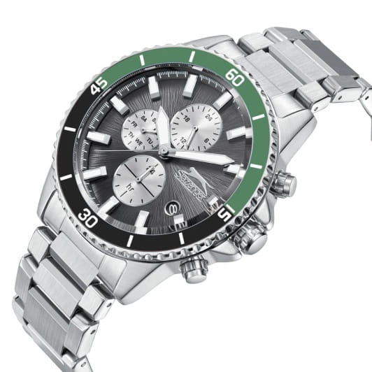Мужские кварцевые часы Slazenger — это выразительный и функциональный аксессуар. Корпус диаметром 44 мм и толщиной 13 мм выполнен из суперметалла. БезельБезельВнешний ободок, закрепляющий стекло. В спортивных часах так называется поворотное кольцо с делениями на циферблате, выполняет роль таймера – замеряет отрезки времени на шкале. Неподвижный безель – элемент декора. Однонаправленно вращающийся безель на дайверских часах позволяет фиксировать моменты погружения и выныривания на поверхность. из суперметалла с IP-покрытиемIP-покрытиеМетод ионного напыления. Демонстрирует повышенную устойчивость к истиранию, окислению и химическим веществам. Под воздействием высокого давления и температуры около 1500°C молекулы металла надёжно соединяются с частицами корпуса часов.. Циферблат серого цвета оформлен индексами и стрелками. Циферблат защищён минеральным стекломМинеральное стеклоМинеральное стекло представляет собой искусственно выращенный минерал кварца. Такое стекло отличается особой устойчивостью к повреждениям и царапинам. Уступает по некоторым качествам сапфировому стеклу.. Механизм — кварцевый калибр. Часы оснащены индикацией дня недели, даты и 12/24-часового формата времени. Окошко даты расположено между 4 и 5 часами. Часы оснащены браслетом из суперметалла с раскладной застёжкойРаскладная застёжкаТакой тип застёжки используется только на браслетах из металла. Она никогда не раскрывается полностью, происходит разделение на 2 и более частей. Раскладывающая застёжка снизит вероятность потери часов к минимуму.. Водонепроницаемость 100 м позволяет использовать часы для плавания и повседневного ношения. Гарантия — 12 месяцев. Идеальный выбор для тех, кто ценит стиль, функциональность и качество.