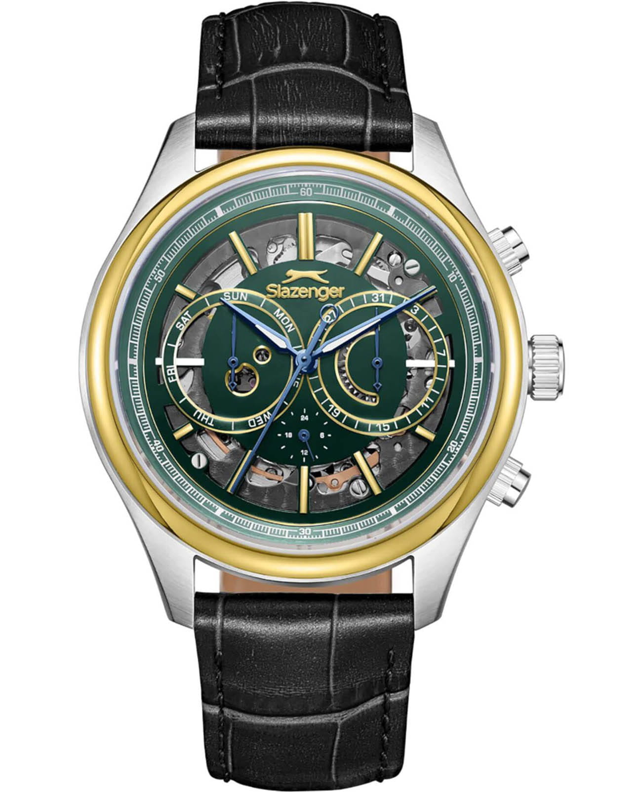 Мужские механические часы с автоподзаводом Slazenger — это выразительный и функциональный аксессуар. Корпус диаметром 41 мм и толщиной 16 мм выполнен из нержавеющей стали 316L. БезельБезельВнешний ободок, закрепляющий стекло. В спортивных часах так называется поворотное кольцо с делениями на циферблате, выполняет роль таймера – замеряет отрезки времени на шкале. Неподвижный безель – элемент декора. Однонаправленно вращающийся безель на дайверских часах позволяет фиксировать моменты погружения и выныривания на поверхность. с IP-покрытиемIP-покрытиеМетод ионного напыления. Демонстрирует повышенную устойчивость к истиранию, окислению и химическим веществам. Под воздействием высокого давления и температуры около 1500°C молекулы металла надёжно соединяются с частицами корпуса часов.. Циферблат зелёного цвета частично скелетонизирован, что позволяет наблюдать за работой механизма. Циферблат защищён минеральным стекломМинеральное стеклоМинеральное стекло представляет собой искусственно выращенный минерал кварца. Такое стекло отличается особой устойчивостью к повреждениям и царапинам. Уступает по некоторым качествам сапфировому стеклу.. Механизм — автоматический. Часы оснащены индикацией дня недели, даты и 12/24-часового формата времени. Прозрачная задняя крышка открывает вид на декорированный механизм. Часы оснащены кожаным ремешком с застёжкой «бабочка» с кнопкамиЗастёжка "бабочка"Такой вид застёжки дополняется предохранителями, помогающими избежать случайного раскрытия браслета. Обладают изящным исполнением. . Водонепроницаемость 100 м позволяет использовать часы для плавания и повседневного ношения. Гарантия — 12 месяцев. Идеальный выбор для тех, кто ценит стиль, функциональность и качество.