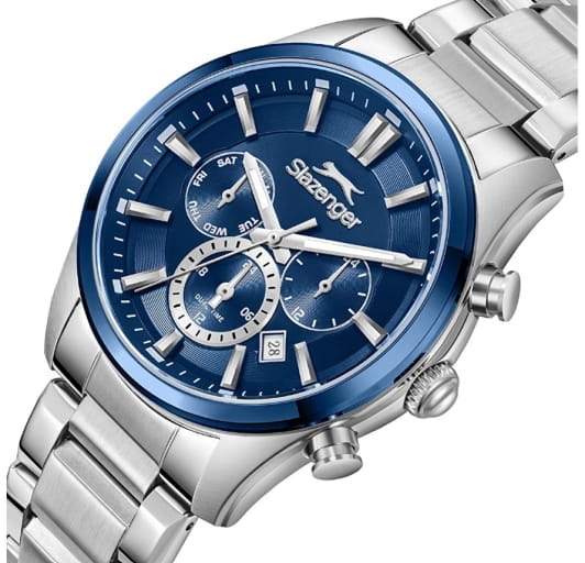 Мужские кварцевые часы Slazenger — это выразительный и функциональный аксессуар. Корпус диаметром 43 мм и толщиной 12 мм выполнен из нержавеющей стали 316L. Циферблат синего цвета оформлен индексами и стрелками с люминесцентным покрытиемЛюминесцентное покрытиеПозволяет считывать показания времени в темноте. Производители наносят на стрелки, часовые индексы, безель или поверхность циферблата светонакопительный состав, дающий холодное свечение., обеспечивающим хорошую читаемость в темноте. Циферблат защищён минеральным стекломМинеральное стеклоМинеральное стекло представляет собой искусственно выращенный минерал кварца. Такое стекло отличается особой устойчивостью к повреждениям и царапинам. Уступает по некоторым качествам сапфировому стеклу.. Механизм — кварцевый калибр JP25. Часы оснащены индикацией дня недели, даты, 12/24-часового формата времени и функцией второго часового пояса (GMT)Второй часовой поясФункция, позволяющая отображать время двух часовых поясов одновременно.. Окошко даты расположено между 4 и 5 часами. Часы оснащены стальным браслетом из нержавеющей стали 316L с раскладной застёжкойРаскладная застёжкаТакой тип застёжки используется только на браслетах из металла. Она никогда не раскрывается полностью, происходит разделение на 2 и более частей. Раскладывающая застёжка снизит вероятность потери часов к минимуму.. Водонепроницаемость 100 м позволяет использовать часы для плавания и повседневного ношения. Гарантия — 12 месяцев. Идеальный выбор для тех, кто ценит стиль, функциональность и качество.