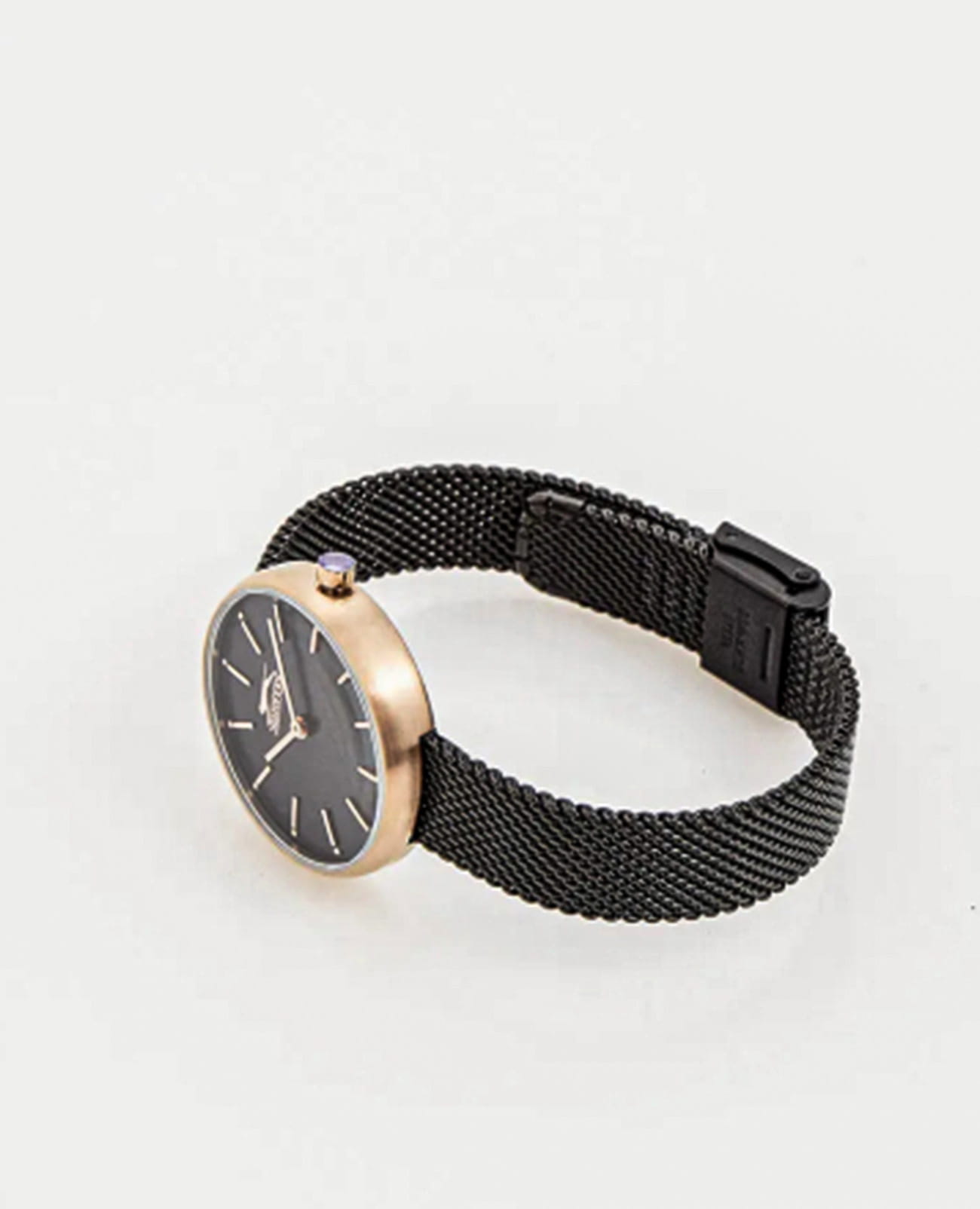 Женские кварцевые часы Slazenger — это стильный аксессуар с круглым корпусом и изящным браслетом миланского плетения. Корпус диаметром 30 мм и толщиной 8 мм выполнен из суперметалла с IP-покрытиемIP-покрытиеМетод ионного напыления. Демонстрирует повышенную устойчивость к истиранию, окислению и химическим веществам. Под воздействием высокого давления и температуры около 1500°C молекулы металла надёжно соединяются с частицами корпуса часов.. Циферблат чёрного цвета оформлен индексами и стрелками. Циферблат защищён минеральным стекломМинеральное стеклоМинеральное стекло представляет собой искусственно выращенный минерал кварца. Такое стекло отличается особой устойчивостью к повреждениям и царапинам. Уступает по некоторым качествам сапфировому стеклу.. Механизм — кварцевый. Часы оснащены браслетом из суперметалла миланского плетения с раскладной застёжкойРаскладная застёжкаТакой тип застёжки используется только на браслетах из металла. Она никогда не раскрывается полностью, происходит разделение на 2 и более частей. Раскладывающая застёжка снизит вероятность потери часов к минимуму.. Водонепроницаемость 30 м позволяет использовать часы в повседневных условиях. Идеальный выбор для тех, кто ценит элегантность и качество.