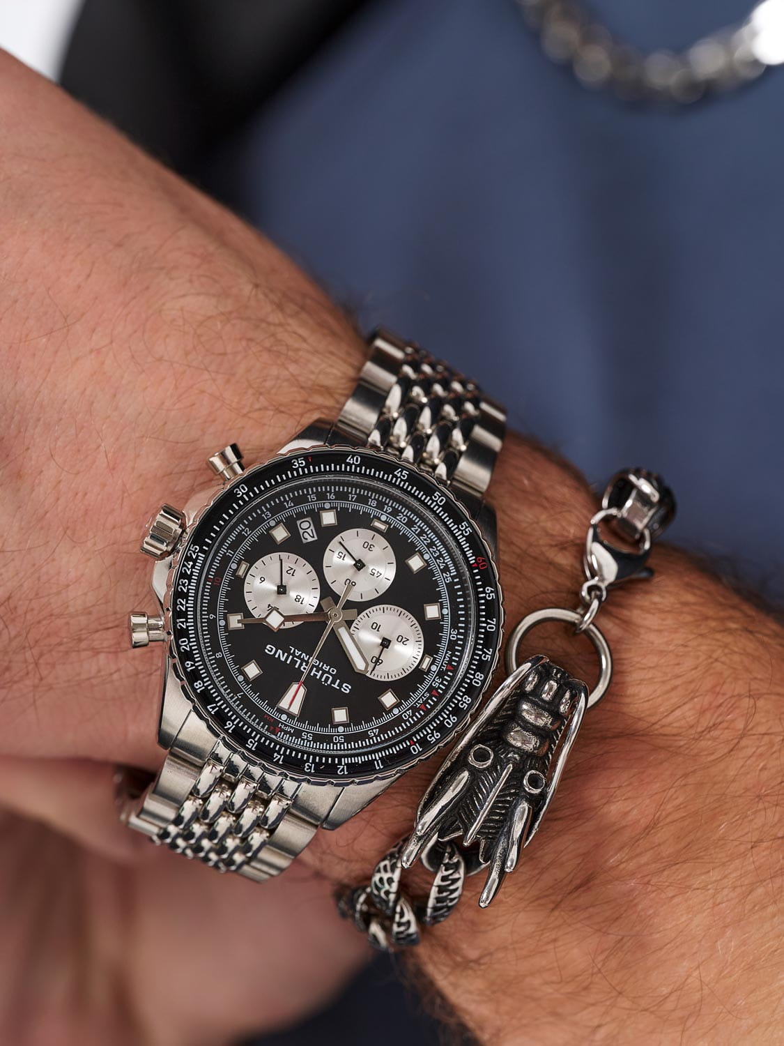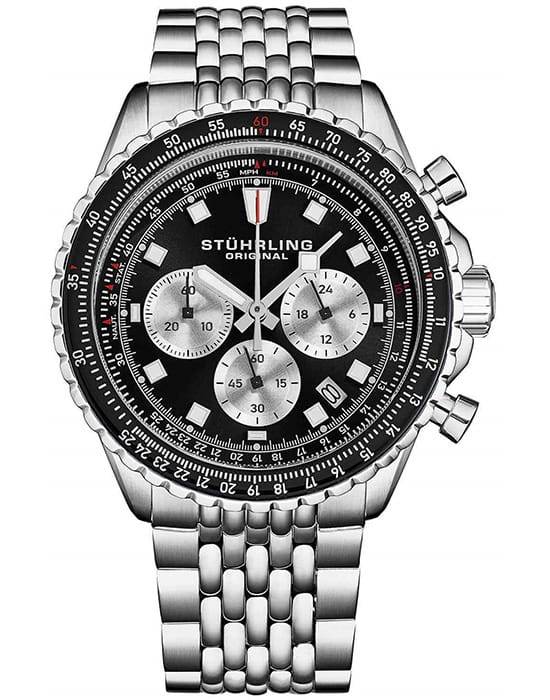 Stuhrling 1010.04 — мощные мужские часы с выразительным спортивным характером и динамичным дизайном. Корпус из нержавеющей стали гармонично сочетается с циферблатом, оформленным рельефным узором и контрастными счётчиками хронографаХронографФункция позволяет измерять отрезки времени с особой точностью: часы, минуты, секунды. Верным признаком хронографа является наличие на циферблате 3 дополнительных окошек-счётчиков.. Широкий безельБезельВнешний ободок, закрепляющий стекло. В спортивных часах так называется поворотное кольцо с делениями на циферблате, выполняет роль таймера – замеряет отрезки времени на шкале. Неподвижный безель – элемент декора. Однонаправленно вращающийся безель на дайверских часах позволяет фиксировать моменты погружения и выныривания на поверхность. с PVD-покрытиемPVDУльтратонкое покрытие наносится в технике вакуумного напыления, сочетает в себе нитрид титана особой прочности со слоем золота или оксида хрома. Несёт в себе декоративную или защитную функцию. подчёркивает брутальный стиль модели, а стрелки и метки с люминесцентным покрытиемЛюминесцентное покрытиеПозволяет считывать показания времени в темноте. Производители наносят на стрелки, часовые индексы, безель или поверхность циферблата светонакопительный состав, дающий холодное свечение. обеспечивают идеальную читаемость в любых условиях. Прочное стекло KrysternaKrysternaKrysterna — инновационное стекло для наручных часов. Благодаря уникальной структуре, Krysterna объединяет ключевые преимущества двух материалов: твердость сапфира, защищающую от царапин, и гибкость минерального стекла, обеспечивающую устойчивость к деформациям. Такая комбинация делает его идеальным решением для часов, подверженных экстремальным нагрузкам, сохраняя при этом оптическую прозрачность. устойчиво к царапинам, сохраняя прозрачность и блеск. Завершает образ стальной браслет с раскладной застёжкойРаскладная застёжкаТакой тип застёжки используется только на браслетах из металла. Она никогда не раскрывается полностью, происходит разделение на 2 и более частей. Раскладывающая застёжка снизит вероятность потери часов к минимуму., гарантирующий комфорт и надёжную фиксацию. Stuhrling — стильная и функциональная модель для уверенных мужчин, ценящих точность и энергию в каждой детали.