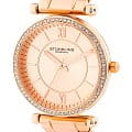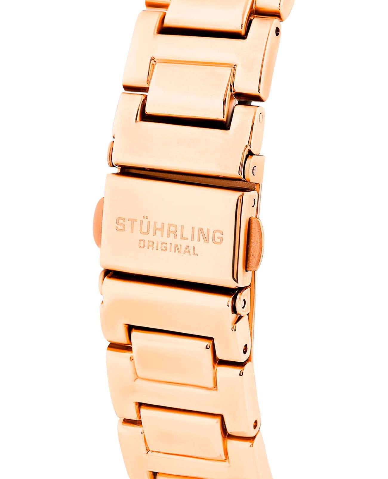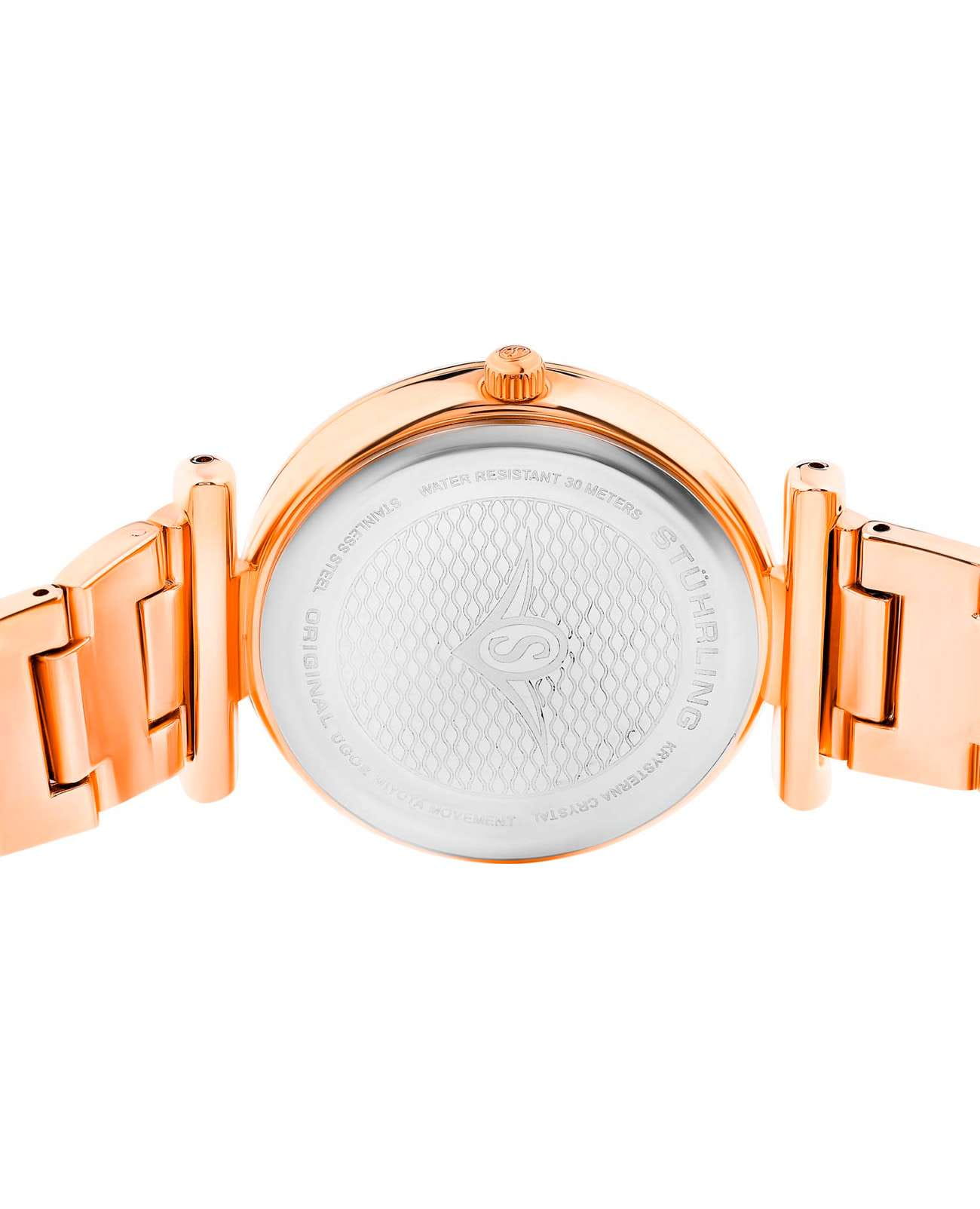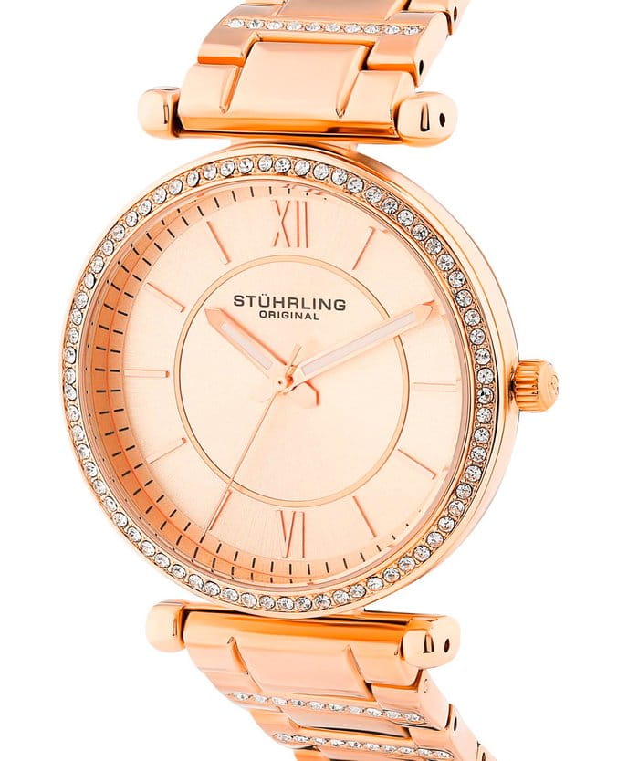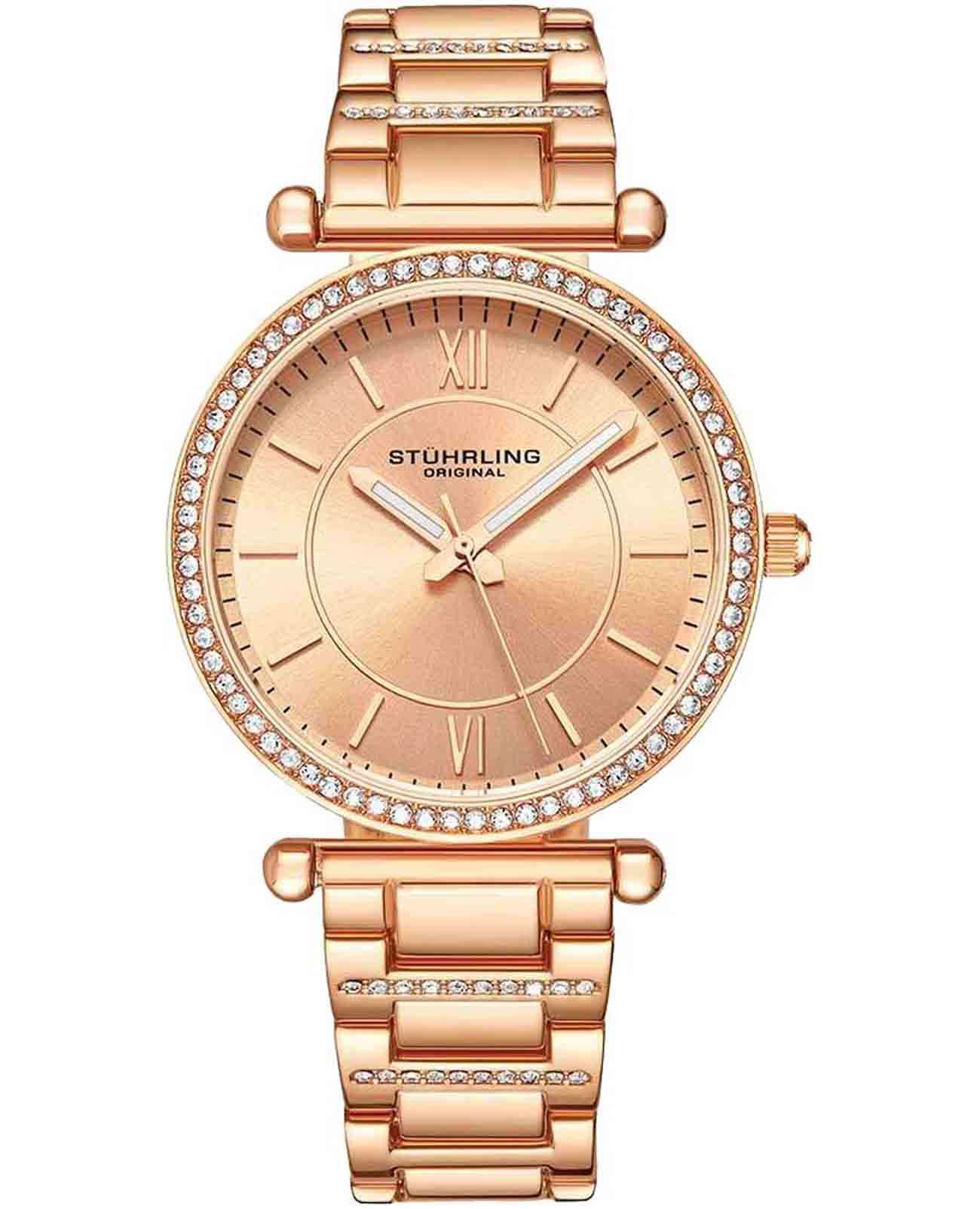 Женские наручные часы Stuhrling 3905.5 из коллекции Aria сочетают в себе элегантный дизайн и функциональность. Модель обладает круглым корпусом, изготовленным из стали с розовым PVD-покрытиемPVDУльтратонкое покрытие наносится в технике вакуумного напыления, сочетает в себе нитрид титана особой прочности со слоем золота или оксида хрома. Несёт в себе декоративную или защитную функцию., что обеспечивает прочность и устойчивость к внешним воздействиям . Браслет из того же материала на раскладной застёжкеРаскладная застёжкаТакой тип застёжки используется только на браслетах из металла. Она никогда не раскрывается полностью, происходит разделение на 2 и более частей. Раскладывающая застёжка снизит вероятность потери часов к минимуму., гарантирующей комфортное ношение . Розовый циферблат выполнен по технологии Sunray (солнечные лучи), что придает ему особый блеск и стиль . Циферблат украшен накладными метками в виде штрихов и двух римских цифр, а также корпус и браслет дополнены камнями, подчеркивающими изысканность модели . Для защиты используется стекло KrysternaKrysternaKrysterna — инновационное стекло для наручных часов. Благодаря уникальной структуре, Krysterna объединяет ключевые преимущества двух материалов: твердость сапфира, защищающую от царапин, и гибкость минерального стекла, обеспечивающую устойчивость к деформациям. Такая комбинация делает его идеальным решением для часов, подверженных экстремальным нагрузкам, сохраняя при этом оптическую прозрачность., изготавливаемое из материалов высшей категории, обеспечивающее повышенную устойчивость к царапинам . Часы работают на кварцевом механизме, что гарантирует точное время без необходимости подзаводки . Водонепроницаемость часов составляет 30WR, что позволяет использовать их в повседневной жизни, включая контакт с водой, например, при мытье рук, но не рекомендуется для плавания или дайвинга.