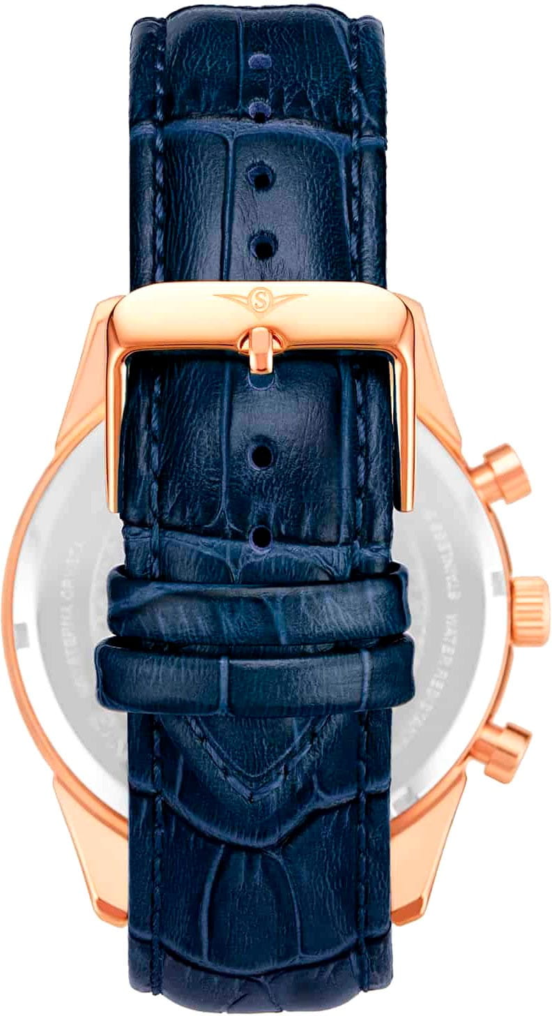 Stuhrling 3975L.7 — стильные мужские часы с выразительным пилотским дизайном и мощным функционалом. Классический циферблат дополнен контрастными счётчиками хронографаХронографФункция позволяет измерять отрезки времени с особой точностью: часы, минуты, секунды. Верным признаком хронографа является наличие на циферблате 3 дополнительных окошек-счётчиков., тахиметрической шкалой по ободу и аккуратным окошком даты, подчёркивающими технический характер модели. Корпус из нержавеющей стали с PVD-покрытиемPVDУльтратонкое покрытие наносится в технике вакуумного напыления, сочетает в себе нитрид титана особой прочности со слоем золота или оксида хрома. Несёт в себе декоративную или защитную функцию. придаёт часам надёжность и современный блеск, а стекло KrysternaKrysternaKrysterna — инновационное стекло для наручных часов. Благодаря уникальной структуре, Krysterna объединяет ключевые преимущества двух материалов: твердость сапфира, защищающую от царапин, и гибкость минерального стекла, обеспечивающую устойчивость к деформациям. Такая комбинация делает его идеальным решением для часов, подверженных экстремальным нагрузкам, сохраняя при этом оптическую прозрачность. защищает поверхность от царапин и сохраняет кристальную прозрачность. Кожаный ремень с классической текстурой аллигатора и стандартной застежкой, обеспечивает комфорт и элегантную посадку на запястье. Stuhrling — гармония силы, точности и изысканного стиля для мужчин, ценящих уверенность и безупречный вкус.