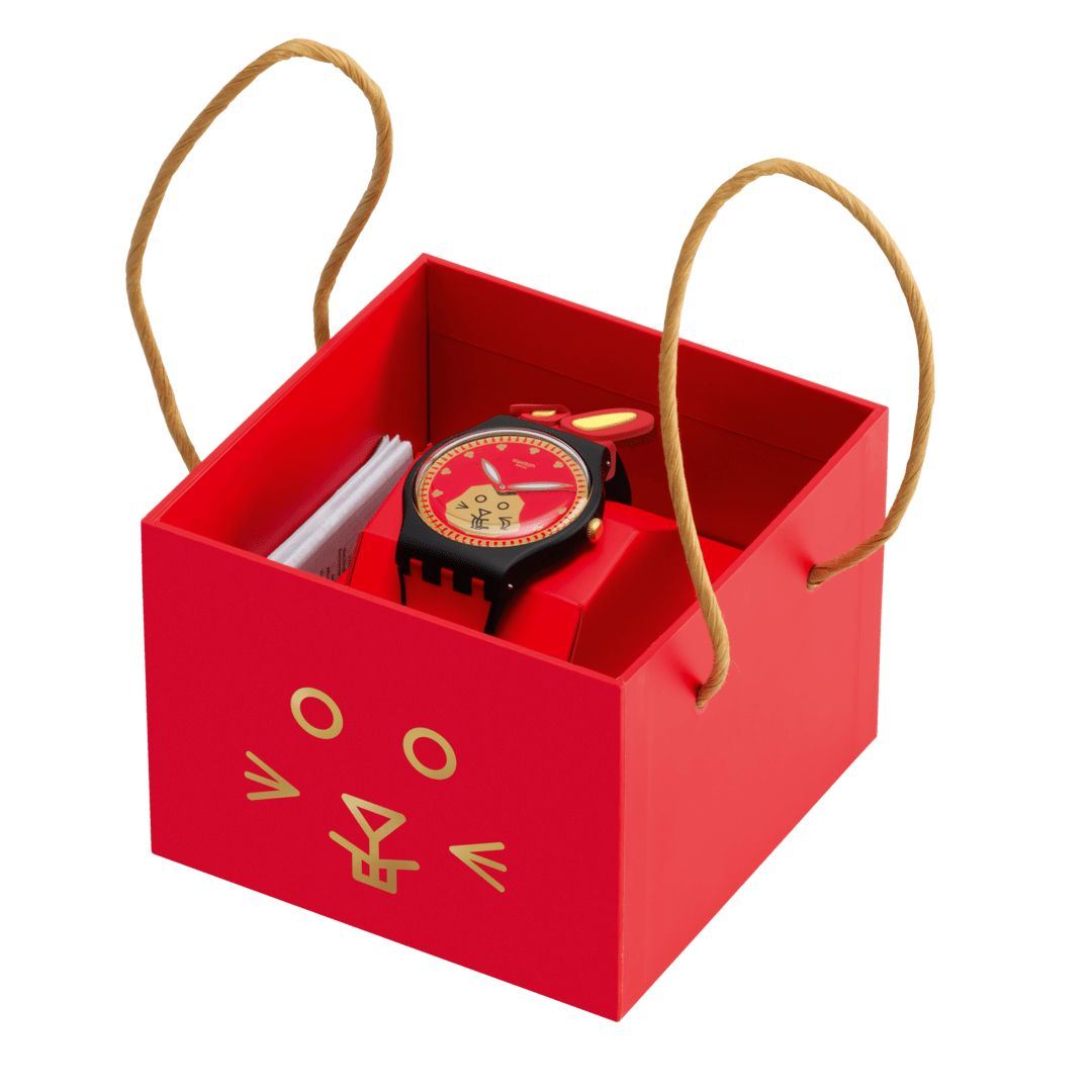 Swatch YEAR OF THE RABBIT (SO32Z107) - это специальная модель часов, посвященная китайскому Новому году 2023 (году Кролика). Часы имеют черный корпус из биокерамики, золотистый циферблат с красным и черным принтом, и силиконовый ремешок. На циферблате изображена мордочка кролика, а стрелки выполнены в виде кроличьих ушей. Ремешок украшен красным принтом и петлей в форме кроличьих ушей. Часы водонепроницаемы до 30 метров, имеют кварцевый механизм и диаметр корпуса 41 мм. Модель унисекс сочетает в себе традиционные китайские символы удачи с инновационными материалами Swatch.