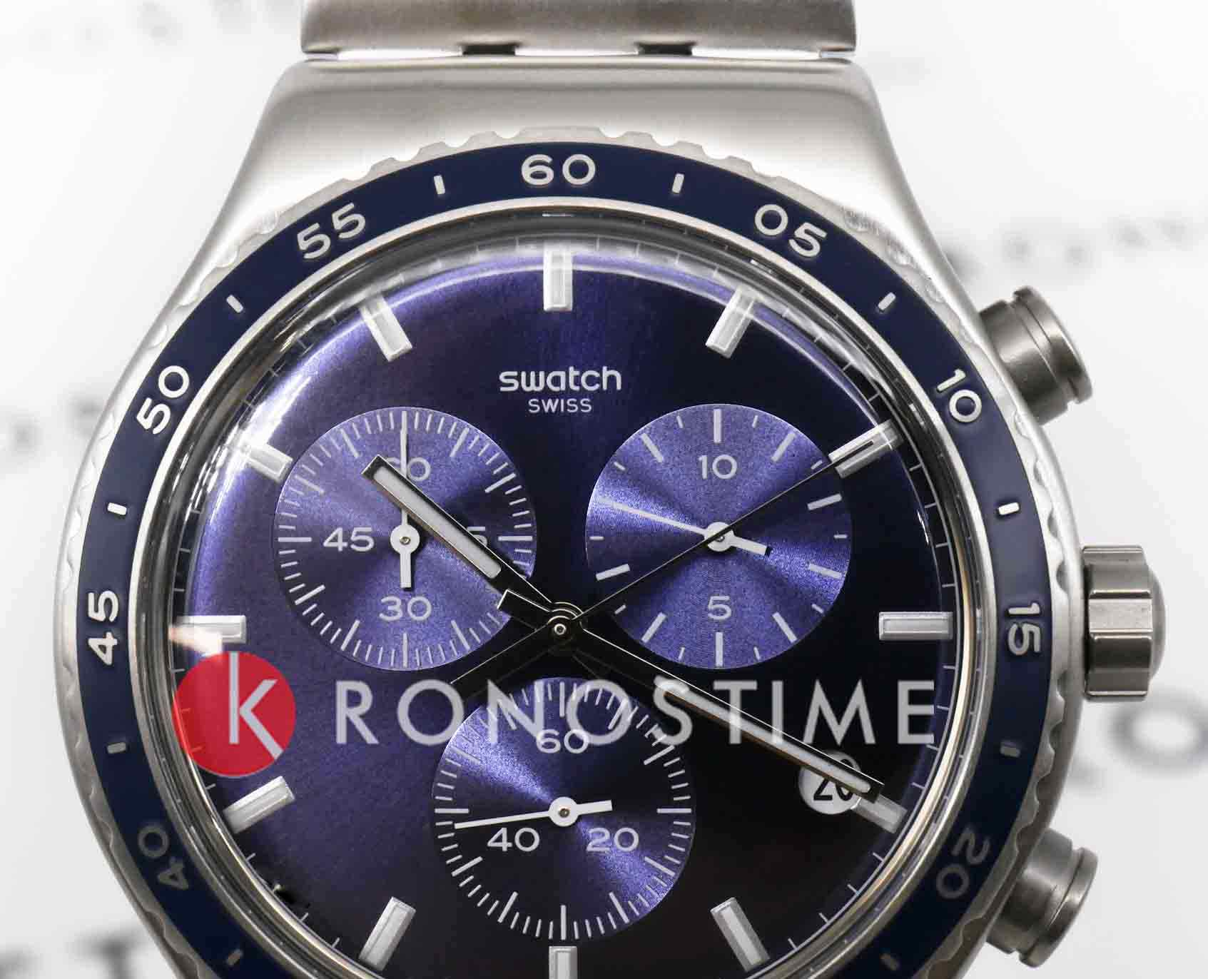 Часы Swatch YVS496G — это стильный и современный аксессуар для тех, кто ценит лёгкость и комфорт. Эта стильная модель часов из нержавеющей стали дополнена матовым металлическим браслетом из нержавеющей стали со съемными звеньями и застёжкой «бабочка»Застёжка "бабочка"Такой вид застёжки дополняется предохранителями, помогающими избежать случайного раскрытия браслета. Обладают изящным исполнением. . Синий циферблат с радиальной полировкой оснащен хронографомХронографФункция позволяет измерять отрезки времени с особой точностью: часы, минуты, секунды. Верным признаком хронографа является наличие на циферблате 3 дополнительных окошек-счётчиков. и светящимися в темноте индексами и стрелками из-за люминесцентного покрытияЛюминесцентное покрытиеПозволяет считывать показания времени в темноте. Производители наносят на стрелки, часовые индексы, безель или поверхность циферблата светонакопительный состав, дающий холодное свечение. заключен в матовый корпус из нержавеющей стали. Завершают образ индикатор даты в положении «4 часа» на циферблате, а также серебристые цифры и индексы на синем безелеБезельВнешний ободок, закрепляющий стекло. В спортивных часах так называется поворотное кольцо с делениями на циферблате, выполняет роль таймера – замеряет отрезки времени на шкале. Неподвижный безель – элемент декора. Однонаправленно вращающийся безель на дайверских часах позволяет фиксировать моменты погружения и выныривания на поверхность. из нержавеющей стали с PVDPVDУльтратонкое покрытие наносится в технике вакуумного напыления, сочетает в себе нитрид титана особой прочности со слоем золота или оксида хрома. Несёт в себе декоративную или защитную функцию. покрытием. Водозащита 30 метров делает часы практичными для повседневного использования. Эти часы подойдут для повседневного ношения и станут ярким акцентом в вашем наряде.