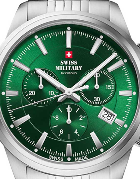 Часы Swiss Military SM34107.04 — это хронограф, сочетающий стиль и функциональность. Корпус диаметром 40 мм выполнен из нержавеющей стали, что обеспечивает долговечность и надёжность. Циферблат с солнечным узором украшен белыми люминесцентными индексамиЛюминесцентное покрытиеПозволяет считывать показания времени в темноте. Производители наносят на стрелки, часовые индексы, безель или поверхность циферблата светонакопительный состав, дающий холодное свечение. и стрелками, что позволяет легко считывать время в любых условиях. Защиту циферблата обеспечивает сапфировое стеклоСапфировое стеклоПрочный и надёжный материал из кристалла сапфира синтетического происхождения, характеризующийся особой твёрдостью и устойчивостью к царапинам и повреждениям., устойчивое к царапинам. Водозащита до 10 ATM делает часы подходящими для плавания и других водных активностей. Швейцарский кварцевый механизм обеспечивает высокую точность измерения времени и функции хронографа. Стальной браслет на раскладной застёжкеРаскладная застёжкаТакой тип застёжки используется только на браслетах из металла. Она никогда не раскрывается полностью, происходит разделение на 2 и более частей. Раскладывающая застёжка снизит вероятность потери часов к минимуму. гарантирует комфортное ношение и надёжную фиксацию. Часы сопровождаются 5-летней международной гарантией, подтверждающей их высокое качество и надёжность. Swiss Military — это идеальный выбор для мужчин, которые ценят швейцарское качество и ведут активный образ жизни.