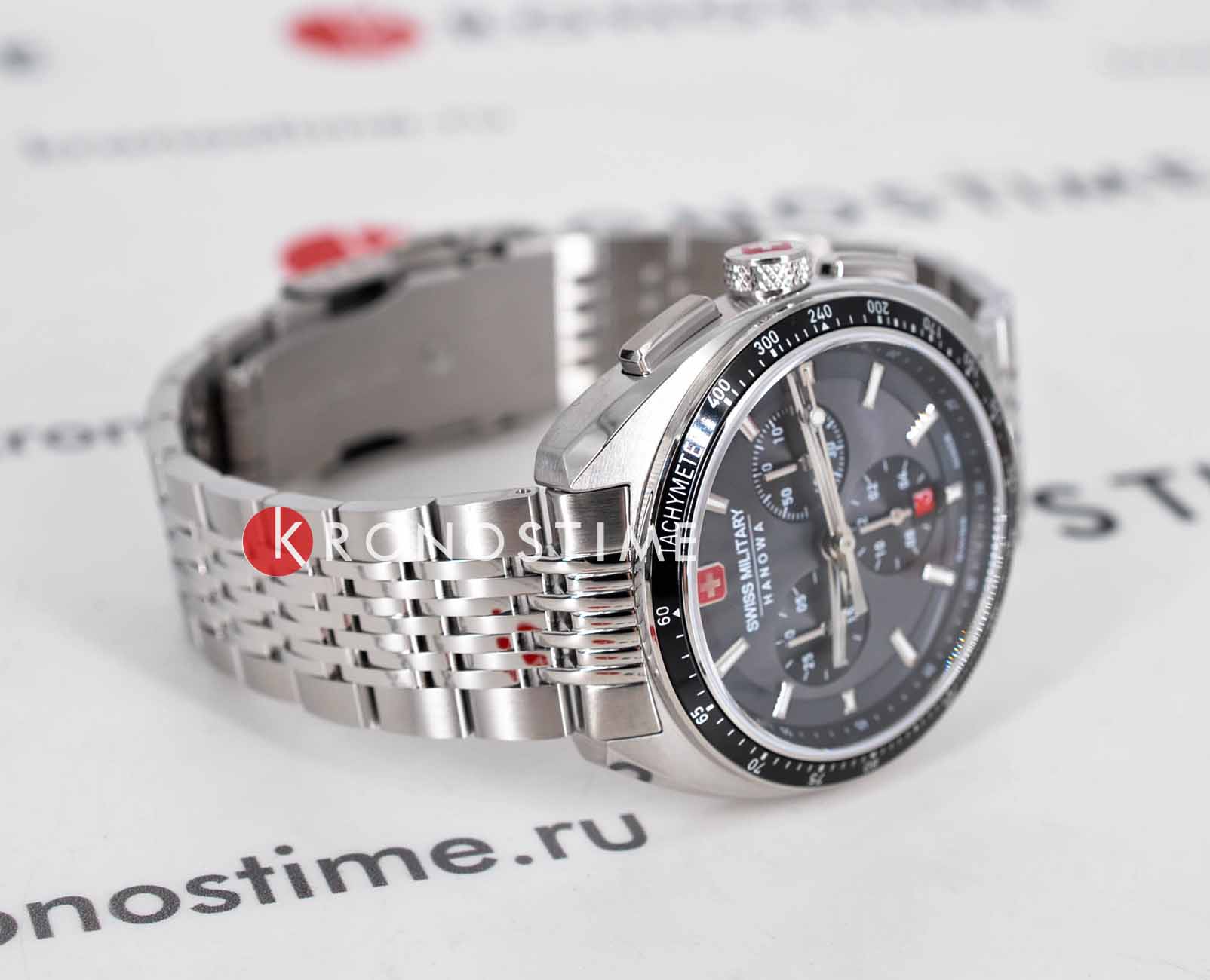Мужские швейцарские часы-хронографХронографФункция позволяет измерять отрезки времени с особой точностью: часы, минуты, секунды. Верным признаком хронографа является наличие на циферблате 3 дополнительных окошек-счётчиков. Swiss Military Hanowa SMWGI0003302, кварцевый механизм с высокой точностью. Сапфировое стеклоСапфировое стеклоПрочный и надёжный материал из кристалла сапфира синтетического происхождения, характеризующийся особой твёрдостью и устойчивостью к царапинам и повреждениям. устойчивое к появлению царапин, обладающее высокой прозрачностью. Класс водозащиты: 100 метров, позволит плавать, нырять и заниматься другими водными видами спорта. Корпус часов изготовлен из стали. Стальной браслет на раскладной застёжкеРаскладная застёжкаТакой тип застёжки используется только на браслетах из металла. Она никогда не раскрывается полностью, происходит разделение на 2 и более частей. Раскладывающая застёжка снизит вероятность потери часов к минимуму.. БезельБезельВнешний ободок, закрепляющий стекло. В спортивных часах так называется поворотное кольцо с делениями на циферблате, выполняет роль таймера – замеряет отрезки времени на шкале. Неподвижный безель – элемент декора. Однонаправленно вращающийся безель на дайверских часах позволяет фиксировать моменты погружения и выныривания на поверхность. с тахиметромТахиметрРазмеченная шкала, располагается на ободке или безеле часов. Тахиметр позволяет рассчитать скорость на определённом участке пути, расстояние измеряется в километрах или милях. изготовлен из нержавеющей стали с IP-покрытиемIP-покрытиеМетод ионного напыления. Демонстрирует повышенную устойчивость к истиранию, окислению и химическим веществам. Под воздействием высокого давления и температуры около 1500°C молекулы металла надёжно соединяются с частицами корпуса часов..