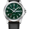 Часы Swiss Military SMP36040.30 — это стильный мужской аксессуар, который сочетает швейцарское качество и функциональность. Корпус диаметром 42 мм выполнен из нержавеющей стали с матовой отделкой, что придаёт часам элегантный и надёжный вид. Зелёный циферблат с солнечным узором украшен арабскими цифрами и треугольными часовыми метками, а также люминесцентными стрелкамиЛюминесцентное покрытиеПозволяет считывать показания времени в темноте. Производители наносят на стрелки, часовые индексы, безель или поверхность циферблата светонакопительный состав, дающий холодное свечение., что обеспечивает превосходную читаемость даже в условиях низкой освещённости. Циферблат защищён сапфировым стекломСапфировое стеклоПрочный и надёжный материал из кристалла сапфира синтетического происхождения, характеризующийся особой твёрдостью и устойчивостью к царапинам и повреждениям. с антибликовым покрытиемАнтибликовое покрытиеСлой оксида металла в 0,13-0,3 микрон, благодаря которому стекло часов не бликует и не отражает свет. Антибликовое покрытие уменьшает отражение света в 10 раз, обеспечивая отличную читаемость показателей циферблата., устойчивым к царапинам.