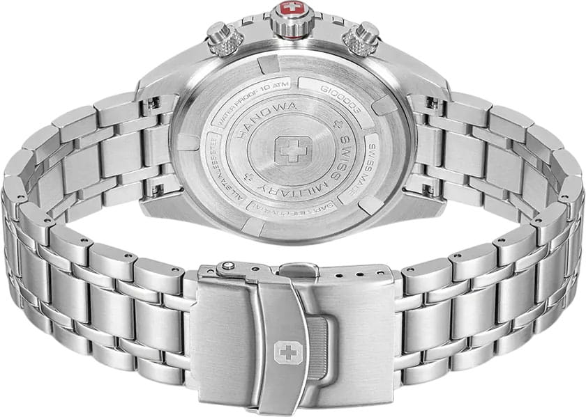 Мужские швейцарские часы Swiss Military Hanowa Afterburn Chrono SMWGI0000308 с хронографомХронографФункция позволяет измерять отрезки времени с особой точностью: часы, минуты, секунды. Верным признаком хронографа является наличие на циферблате 3 дополнительных окошек-счётчиков. и секундомеромСекундомерСекундоме́р — прибор, способный измерять интервалы времени с точностью до долей секунды.. Сапфировое стеклоСапфировое стеклоПрочный и надёжный материал из кристалла сапфира синтетического происхождения, характеризующийся особой твёрдостью и устойчивостью к царапинам и повреждениям. с антибликовым покрытием защищает циферблат от царапин и обеспечивает отличную читаемость при любом освещении. Корпус из нержавеющей стали диаметром 44 мм сбалансирован и элегантен. Браслет с раскладной застёжкойРаскладная застёжкаТакой тип застёжки используется только на браслетах из металла. Она никогда не раскрывается полностью, происходит разделение на 2 и более частей. Раскладывающая застёжка снизит вероятность потери часов к минимуму. идеально дополняют дизайн часов, обеспечивая комфортное ношение. Люминесцентное покрытиеЛюминесцентное покрытиеПозволяет считывать показания времени в темноте. Производители наносят на стрелки, часовые индексы, безель или поверхность циферблата светонакопительный состав, дающий холодное свечение. стрелок и меток позволит вам следить за временем даже в полной темноте. Стальной безельБезельВнешний ободок, закрепляющий стекло. В спортивных часах так называется поворотное кольцо с делениями на циферблате, выполняет роль таймера – замеряет отрезки времени на шкале. Неподвижный безель – элемент декора. Однонаправленно вращающийся безель на дайверских часах позволяет фиксировать моменты погружения и выныривания на поверхность. с PVD-покрытиемPVDУльтратонкое покрытие наносится в технике вакуумного напыления, сочетает в себе нитрид титана особой прочности со слоем золота или оксида хрома. Несёт в себе декоративную или защитную функцию.. Часы оснащены центральной секундной стрелкой и окошком даты в положении «6 часов», что делает их функциональными для повседневного использования. ТахиметрТахиметрРазмеченная шкала, располагается на ободке или безеле часов. Тахиметр позволяет рассчитать скорость на определённом участке пути, расстояние измеряется в километрах или милях. по внешнему краю. Водонепроницаемость до 100 метров. Идеальный выбор для тех, кто ценит качество и долговечность.
