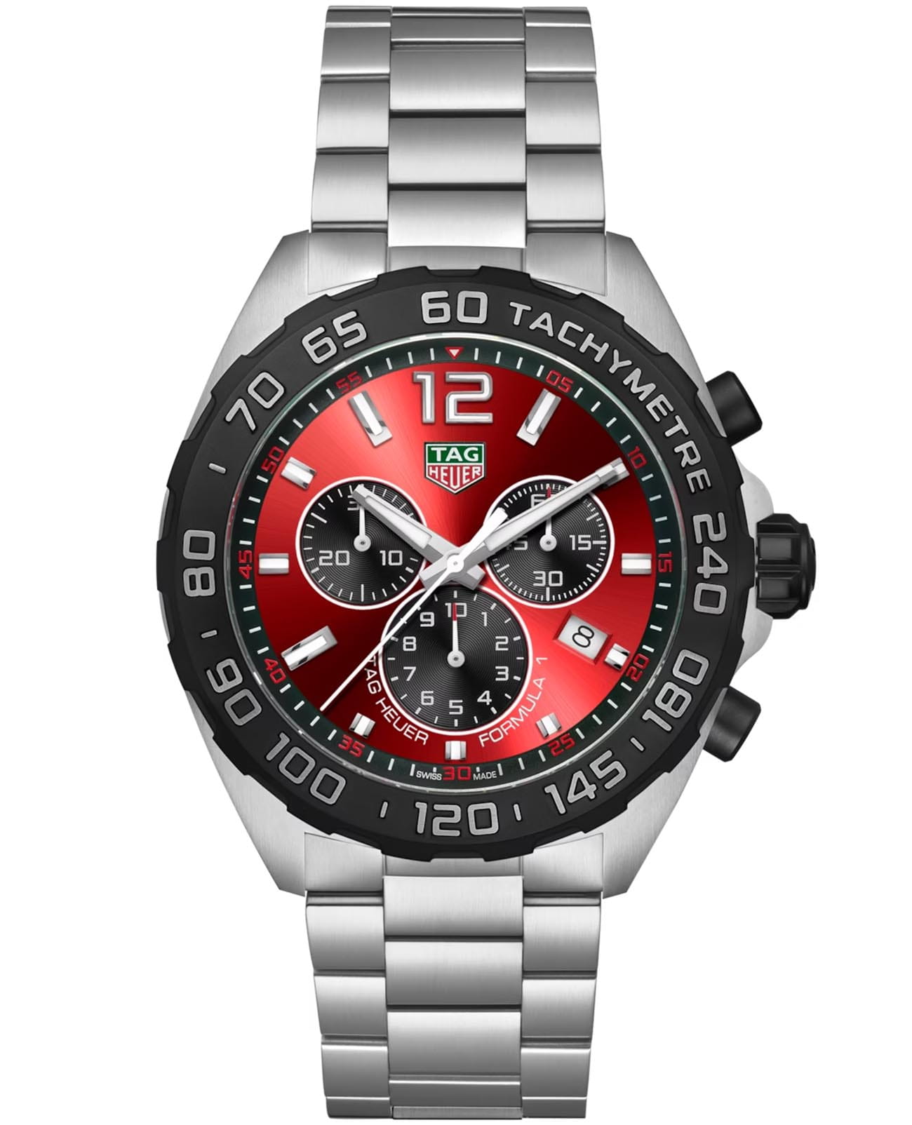 Мужские наручные часы-хронографХронографФункция позволяет измерять отрезки времени с особой точностью: часы, минуты, секунды. Верным признаком хронографа является наличие на циферблате 3 дополнительных окошек-счётчиков. TAG Heuer Formula 1 CAZ101AN.BA0842 с надёжным кварцевым механизмом. Корпус и браслет часов изготовлен из нержавеющей стали. БезельБезельВнешний ободок, закрепляющий стекло. В спортивных часах так называется поворотное кольцо с делениями на циферблате, выполняет роль таймера – замеряет отрезки времени на шкале. Неподвижный безель – элемент декора. Однонаправленно вращающийся безель на дайверских часах позволяет фиксировать моменты погружения и выныривания на поверхность. с PVD-покрытиемPVDУльтратонкое покрытие наносится в технике вакуумного напыления, сочетает в себе нитрид титана особой прочности со слоем золота или оксида хрома. Несёт в себе декоративную или защитную функцию. и шкалой тахиметраТахиметрРазмеченная шкала, располагается на ободке или безеле часов. Тахиметр позволяет рассчитать скорость на определённом участке пути, расстояние измеряется в километрах или милях.. Сапфировое стеклоСапфировое стеклоПрочный и надёжный материал из кристалла сапфира синтетического происхождения, характеризующийся особой твёрдостью и устойчивостью к царапинам и повреждениям. устойчивое к появлению царапин, обладающее высокой прозрачностью. Стрелки с люминесцентным покрытиемЛюминесцентное покрытиеПозволяет считывать показания времени в темноте. Производители наносят на стрелки, часовые индексы, безель или поверхность циферблата светонакопительный состав, дающий холодное свечение.. Класс водозащиты: 200 метров, позволит плавать, нырять и заниматься другими водными видами спорта. Стальной браслет на раскладной застёжкеРаскладная застёжкаТакой тип застёжки используется только на браслетах из металла. Она никогда не раскрывается полностью, происходит разделение на 2 и более частей. Раскладывающая застёжка снизит вероятность потери часов к минимуму.. Окошко даты находится в положении между 4 и 5 часов.