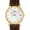 TISSOT T52541131 T-Classic Desire Quartz - мужские кварцевые наручные часы Корпус этих часов небольшого размера (34 мм) и выполнен из нержавеющей стали L316 с PVD-покрытием цвета желтого золота Модель TISSOT T52541131 T-Classic Desire Quartz имеет устойчивое к царапинам сапфировое стекло, ремешок из натуральной кожи коричневого цвета, белый циферблат Калибр механизма: ETA F06111 Класс водозащиты: 30 м / 3 АТМ (защита от брызг и случайных капель) Дополнительные функции и особенности: отображение числа Полная заводская комплектация TISSOT: оригинальные часы, фирменная коробка, инструкция, сервисная книжка, роман о часовой фабрике, миникаталог, замшевый фирменный чехол черного цвета для хранения и/или переноски часов, кассовый и товарный чеки Международная гарантия 2 года Производство и сборка: Швейцария