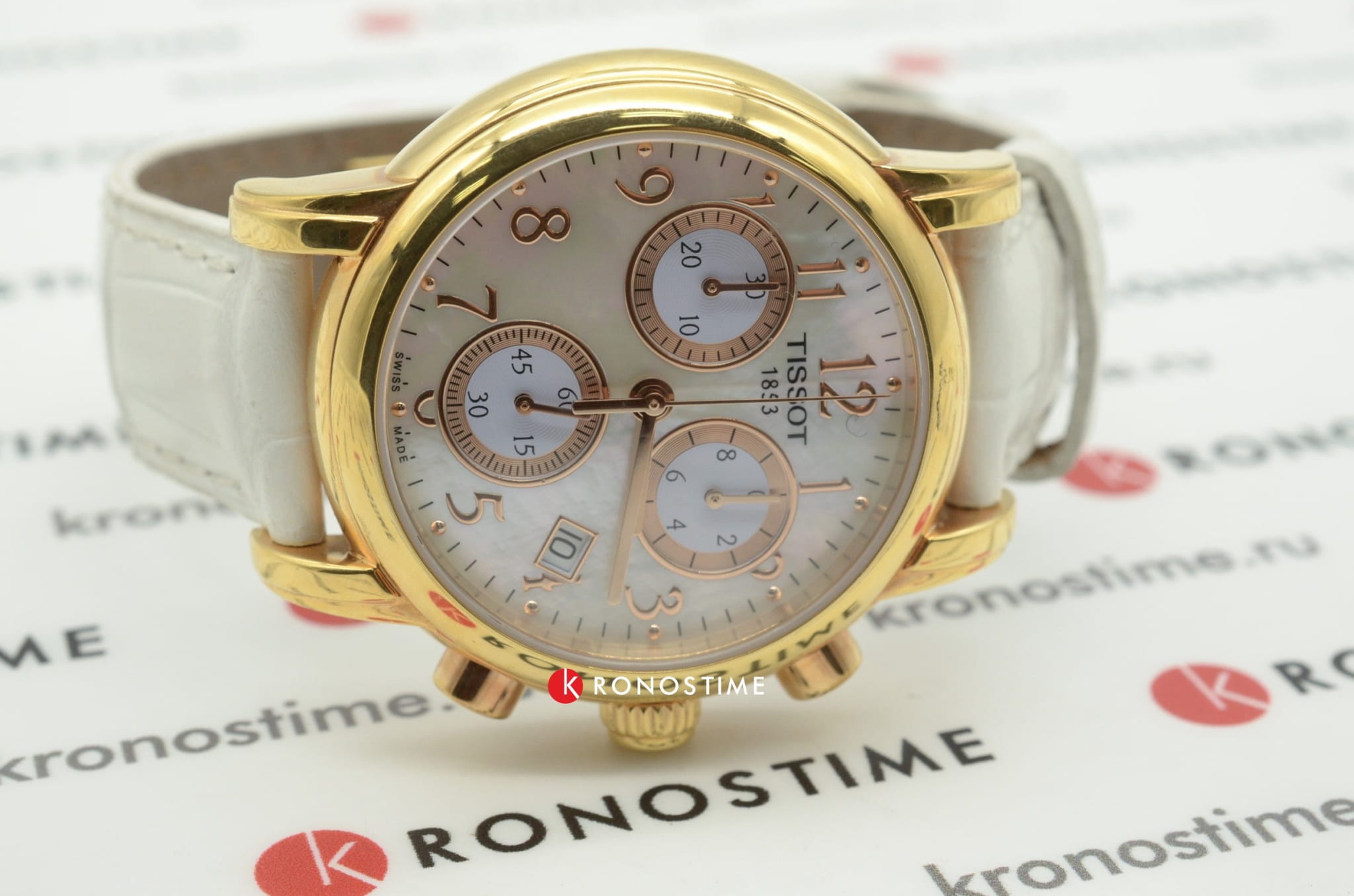 TISSOT Dressport Quartz Chronograph - женские кварцевые наручные часы. Корпус этих часов среднего размера (35 мм) и выполнен из нержавеющей стали L316 с PVD-покрытием цвета розового золота. Модель имеет устойчивое к царапинам сапфировое стекло, ремешок из натуральной кожи белого цвета, перламутровый циферблат. Калибр механизма: ETA G15.211. Класс водозащиты: 30 м / 3 АТМ (защита от брызг и случайных капель). Дополнительные функции и особенности: отображение числа, хронограф (секундомер).