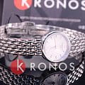 Серебристая модель имеет отличительную особенность - браслет оригинального плетения, который свободно сидит на запястье. Благодаря этому часы выглядят как ювелирное украшение. В остальном аксессуар отличается минимализмом, лаконичный циферблат, тонкие стрелки, отсутствие декора. Кварцевый калибр ETA 901.001 с высокой точностью хода. Сапфировое стекло, устойчивое к появлению царапин на поверхности. Долговечная нержавеющая сталь. Габариты: 19,5 x 19,5 x 5 мм.