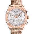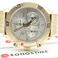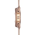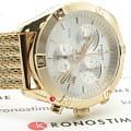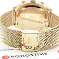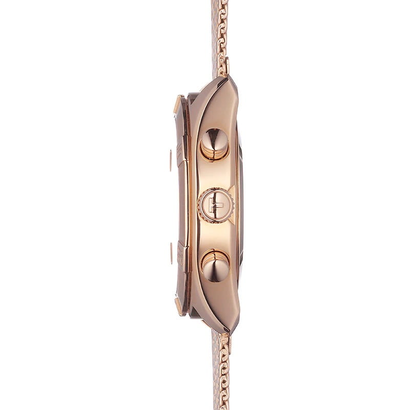 Оригинальный браслет миланского плетения стильно смотрится на запястье, особую привлекательность модель имеет благодаря PVD-покрытиюPVDУльтратонкое покрытие наносится в технике вакуумного напыления, сочетает в себе нитрид титана особой прочности со слоем золота или оксида хрома. Несёт в себе декоративную или защитную функцию. в цвете розового золота. В серебристом цвете выполнен циферблат. Кварцевый калибр швейцарского производства ETA G15.212. Ультрапрочное стекло из сапфира. Люминесцентная подсветкаЛюминесцентное покрытиеПозволяет считывать показания времени в темноте. Производители наносят на стрелки, часовые индексы, безель или поверхность циферблата светонакопительный состав, дающий холодное свечение.. Отображение числа, EOLEOLПредставляет собой систему, уведомляющую владельца часов о необходимости замены элемента питания. За 2 недели до полного разряда батарейки секундная стрелка перестаёт ходить чётко и начинает перепрыгивать на 3-4 деления.. Габариты: 38 x 38 x 10,5 мм.