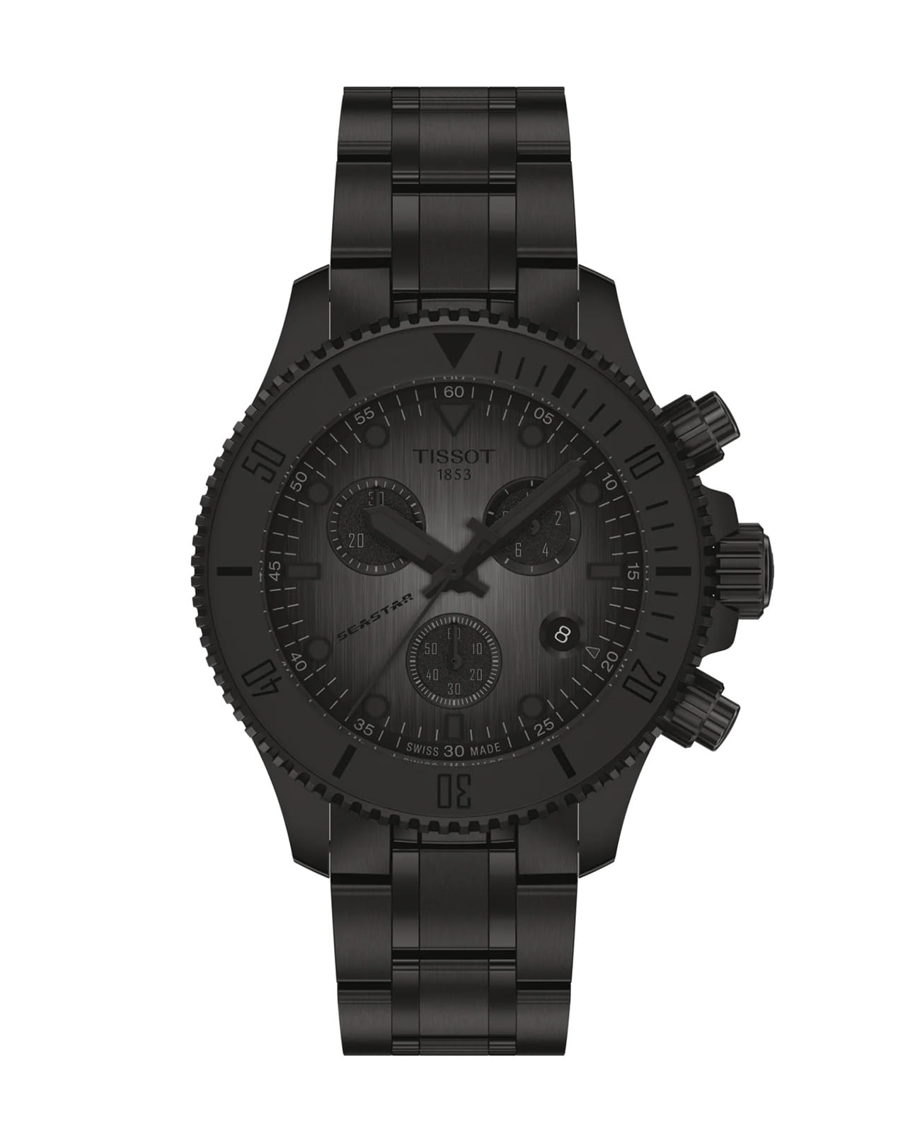 Мужские кварцевые часы Tissot Seastar 38 мм T1202173306100 — это современная интерпретация классического дайвинг-хронографа, сочетающая в себе мощь наследия и передовые технологии. Модель выполнена в круглой форме из нержавеющей стали 316L с PVD-покрытиемPVDУльтратонкое покрытие наносится в технике вакуумного напыления, сочетает в себе нитрид титана особой прочности со слоем золота или оксида хрома. Несёт в себе декоративную или защитную функцию. чёрного цвета, что придаёт ей благородный внешний вид и устойчивость к царапинам. Циферблат градиентного серо-чёрного цвета дополнен индексами, а его поверхность защищена сапфировым стекломСапфировое стеклоПрочный и надёжный материал из кристалла сапфира синтетического происхождения, характеризующийся особой твёрдостью и устойчивостью к царапинам и повреждениям. с двусторонним антибликовым покрытиемАнтибликовое покрытиеСлой оксида металла в 0,13-0,3 микрон, благодаря которому стекло часов не бликует и не отражает свет. Антибликовое покрытие уменьшает отражение света в 10 раз, обеспечивая отличную читаемость показателей циферблата., устойчивым к повреждениям. Стрелки и метки имеют люминесцентное покрытиеЛюминесцентное покрытиеПозволяет считывать показания времени в темноте. Производители наносят на стрелки, часовые индексы, безель или поверхность циферблата светонакопительный состав, дающий холодное свечение. Super-LumiNova®, обеспечивающее отличную читаемость даже в условиях слабого освещения. Часы оснащены швейцарским кварцевым хронографическим механизмом с функцией EOL (индикатор окончания срока службы батарейки), который обеспечивает точную работу и минимальное обслуживание. Браслет из нержавеющей стали с покрытием чёрного цвета оснащён раскладной застёжкойРаскладная застёжкаТакой тип застёжки используется только на браслетах из металла. Она никогда не раскрывается полностью, происходит разделение на 2 и более частей. Раскладывающая застёжка снизит вероятность потери часов к минимуму. с кнопками и защитой, обеспечивающей комфорт и надёжную фиксацию на запястье. Ремешок является быстросменным, что позволяет легко менять его по желанию. Функциональность модели включает хронограф с центральной секундной стрелкой. Водонепроницаемость позволяет использовать модель при плавании, нырянии и других водных активностях без глубокого погружения. Эти часы станут универсальным аксессуаром для тех, кто ценит сочетание стиля, функциональности и швейцарского мастерства — идеальный выбор для повседневной носки и активного образа жизни.
