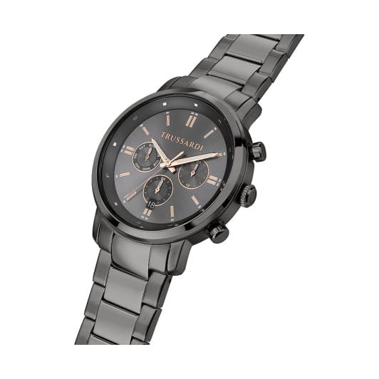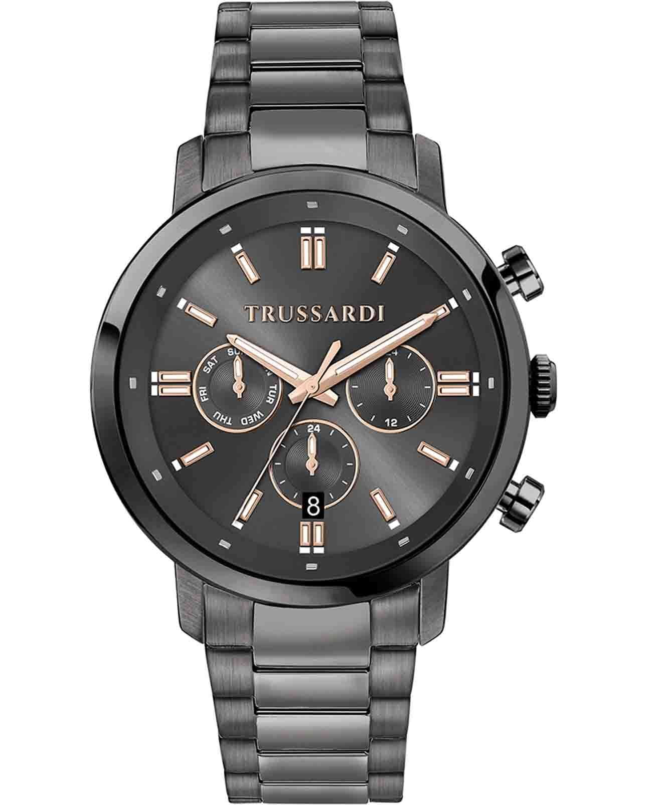 Итальянские мужские часы Trussardi T-Couple R2453147012 - это стильный мужской аксессуар, который сочетает элегантный дизайн и практичность. Корпус выполнен из нержавеющей стали с IP-покрытиемIP-покрытиеМетод ионного напыления. Демонстрирует повышенную устойчивость к истиранию, окислению и химическим веществам. Под воздействием высокого давления и температуры около 1500°C молекулы металла надёжно соединяются с частицами корпуса часов., что обеспечивает долговечность и утончённый внешний вид. Надежное минеральное стеклоМинеральное стеклоМинеральное стекло представляет собой искусственно выращенный минерал кварца. Такое стекло отличается особой устойчивостью к повреждениям и царапинам. Уступает по некоторым качествам сапфировому стеклу. защищает циферблат от царапин и обеспечивает долговечность. Модель оснащена кварцевым механизмом, обеспечивающим высокую точность хода. Браслет из нержавеющей стали с IP-покрытиемIP-покрытиеМетод ионного напыления. Демонстрирует повышенную устойчивость к истиранию, окислению и химическим веществам. Под воздействием высокого давления и температуры около 1500°C молекулы металла надёжно соединяются с частицами корпуса часов.  с раскладной застёжкойРаскладная застёжкаТакой тип застёжки используется только на браслетах из металла. Она никогда не раскрывается полностью, происходит разделение на 2 и более частей. Раскладывающая застёжка снизит вероятность потери часов к минимуму. обеспечивает комфортное ношение. Водозащита 50 метров позволит защитить корпус от случайных брызг или капель дождя. Вынесенный циферблат с 24-х часовым указателем времени, второй часовой пояс в 24-х часовом формате, а также вынесенный циферблат с указателем дня недели. Окошко даты в положении 6 часов. Стрелки и метки оснащены люминесцентным покрытиемЛюминесцентное покрытиеПозволяет считывать показания времени в темноте. Производители наносят на стрелки, часовые индексы, безель или поверхность циферблата светонакопительный состав, дающий холодное свечение., обеспечивающим отличную видимость даже при слабом освещении. Эта модель – отличный выбор для тех, кто ищет сочетание стиля, качества и функциональности. Часы станут не только полезным аксессуаром, но и выразительным элементом вашего имиджа.