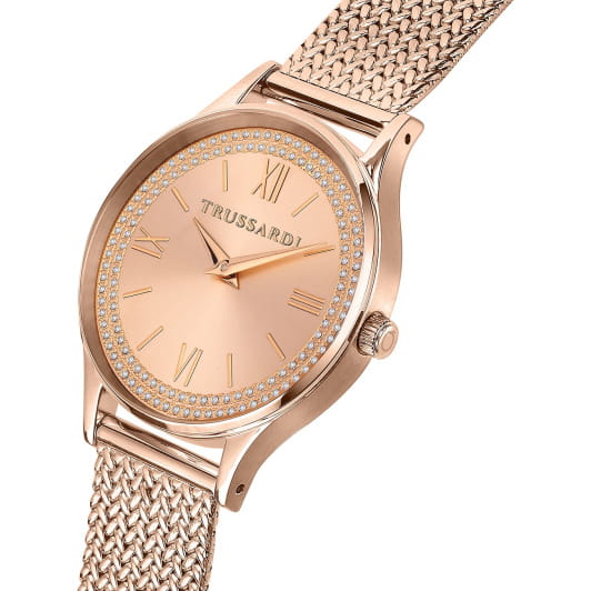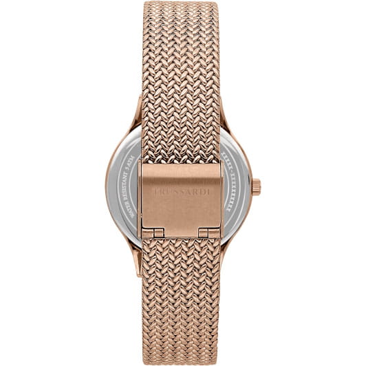 Итальянские женские часы Trussardi T-Star R2453152505 - это стильный женский аксессуар, который сочетает элегантный дизайн и практичность. Корпус выполнен из нержавеющей стали с IP-покрытиемIP-покрытиеМетод ионного напыления. Демонстрирует повышенную устойчивость к истиранию, окислению и химическим веществам. Под воздействием высокого давления и температуры около 1500°C молекулы металла надёжно соединяются с частицами корпуса часов., что обеспечивает долговечность и утончённый внешний вид. Надежное минеральное стеклоМинеральное стеклоМинеральное стекло представляет собой искусственно выращенный минерал кварца. Такое стекло отличается особой устойчивостью к повреждениям и царапинам. Уступает по некоторым качествам сапфировому стеклу. защищает циферблат от царапин и обеспечивает долговечность. Циферблат украшен кристаллами. Модель оснащена кварцевым механизмом, обеспечивающим высокую точность хода. Браслет из нержавеющей стали с IP-покрытиемIP-покрытиеМетод ионного напыления. Демонстрирует повышенную устойчивость к истиранию, окислению и химическим веществам. Под воздействием высокого давления и температуры около 1500°C молекулы металла надёжно соединяются с частицами корпуса часов. с раскладным замкомРаскладной замокДанный вариант застежки используется только на часах с металлическим браслетом. Отличительная особенность такого крепления в том, что длина браслета становится универсальной и вы можете самостоятельно отрегулировать нужный вам размер – застежка просто двигается по браслету часов. обеспечивает комфортное ношение. Водозащита 50 метров позволит защитить корпус от случайных брызг или капель дождя. Эта модель – отличный выбор для тех, кто ищет сочетание стиля, качества и функциональности. Часы станут не только полезным аксессуаром, но и выразительным элементом вашего имиджа.
