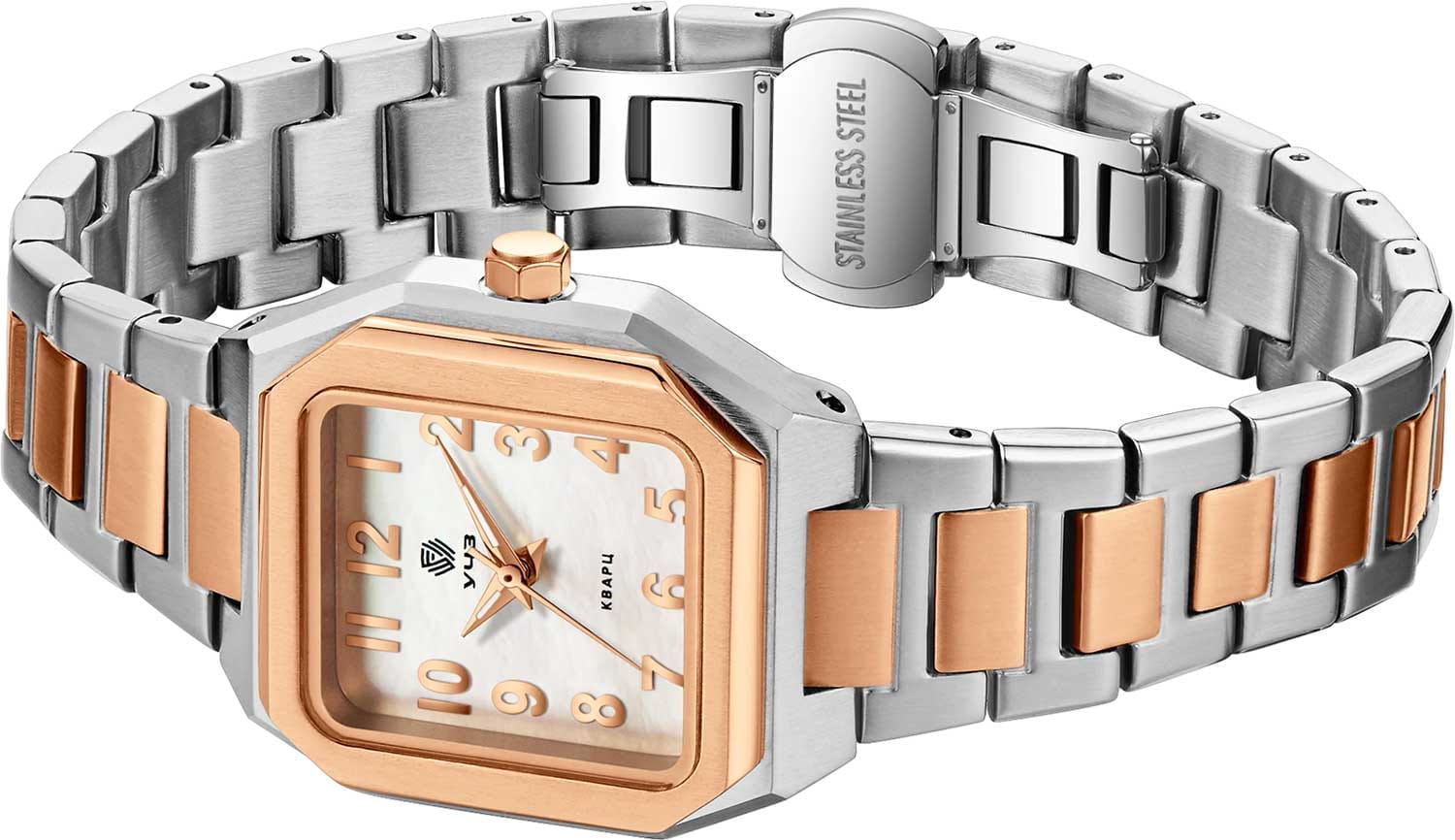 УЧЗ Spectr 3079B-2 — это стильная женская модель, сочетающая в себе элегантный дизайн и чёткую функциональность для каждодневной носки. Квадратный корпус выполнен из стали с безелемБезельВнешний ободок, закрепляющий стекло. В спортивных часах так называется поворотное кольцо с делениями на циферблате, выполняет роль таймера – замеряет отрезки времени на шкале. Неподвижный безель – элемент декора. Однонаправленно вращающийся безель на дайверских часах позволяет фиксировать моменты погружения и выныривания на поверхность. с IP-покрытиемIP-покрытиеМетод ионного напыления. Демонстрирует повышенную устойчивость к истиранию, окислению и химическим веществам. Под воздействием высокого давления и температуры около 1500°C молекулы металла надёжно соединяются с частицами корпуса часов., с компактным размером 29 мм, гармонично дополнен стальным браслетом с IP-покрытиемIP-покрытиеМетод ионного напыления. Демонстрирует повышенную устойчивость к истиранию, окислению и химическим веществам. Под воздействием высокого давления и температуры около 1500°C молекулы металла надёжно соединяются с частицами корпуса часов. на удобной застёжке-бабочкеЗастёжка "бабочка"Такой вид застёжки дополняется предохранителями, помогающими избежать случайного раскрытия браслета. Обладают изящным исполнением. . Циферблат с акцентными минималистичными стрелками с люминисцентным покрытиемЛюминесцентное покрытиеПозволяет считывать показания времени в темноте. Производители наносят на стрелки, часовые индексы, безель или поверхность циферблата светонакопительный состав, дающий холодное свечение. делает модель более практичной. Минеральное стеклоМинеральное стеклоМинеральное стекло представляет собой искусственно выращенный минерал кварца. Такое стекло отличается особой устойчивостью к повреждениям и царапинам. Уступает по некоторым качествам сапфировому стеклу., закалённое для защиты от мелких повреждений, а кварцевый механизм обеспечивает высокую точность. Водозащита 30 м, благодаря чему корпус защищён от брызг воды и дождя. Идеальный выбор для тех, кто ценит элегантный дизайн и качество.