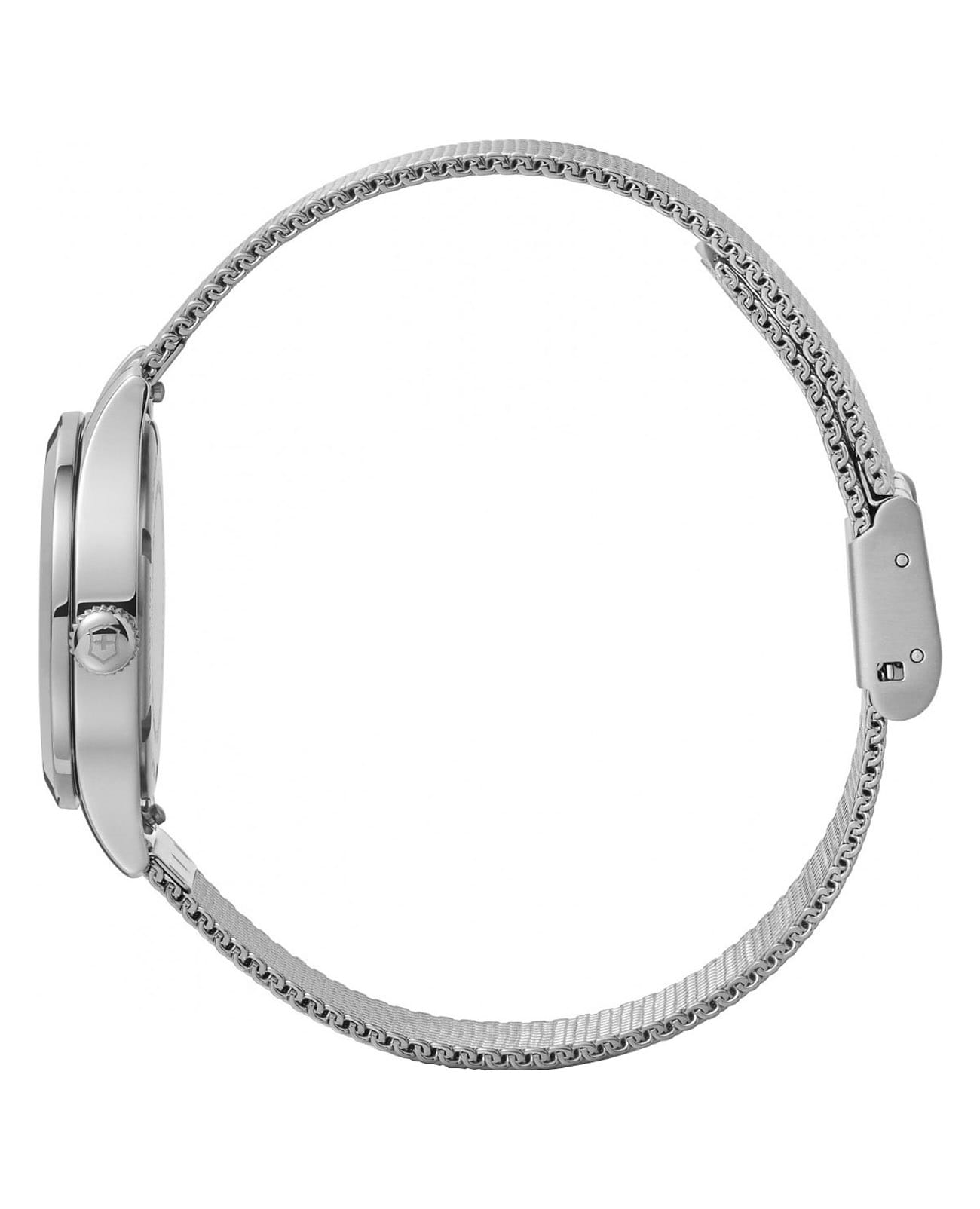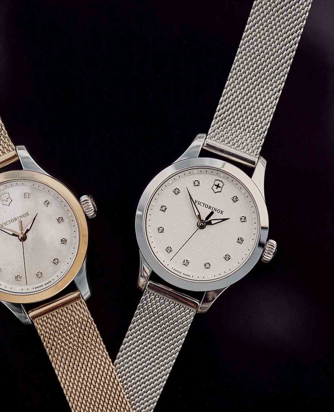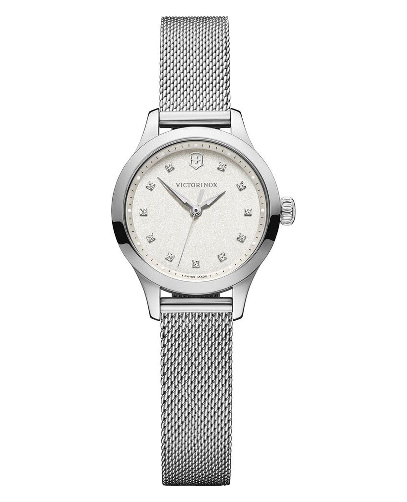 Женские часы Victorinox ALLIANCE XS 241878 с надёжным кварцевым механизмом. Корпус выполнен из нержавеющей стали. Циферблат инкрустирован кристаллами Swarovski. Стрелки и метки с люминесцентным покрытиемЛюминесцентное покрытиеПозволяет считывать показания времени в темноте. Производители наносят на стрелки, часовые индексы, безель или поверхность циферблата светонакопительный состав, дающий холодное свечение.. Класс водозащиты: 100 метров, позволит плавать, нырять и заниматься другими водными видами спорта. Стальной браслет миланского плетения на раскладном замкеРаскладной замокДанный вариант застежки используется только на часах с металлическим браслетом. Отличительная особенность такого крепления в том, что длина браслета становится универсальной и вы можете самостоятельно отрегулировать нужный вам размер – застежка просто двигается по браслету часов..