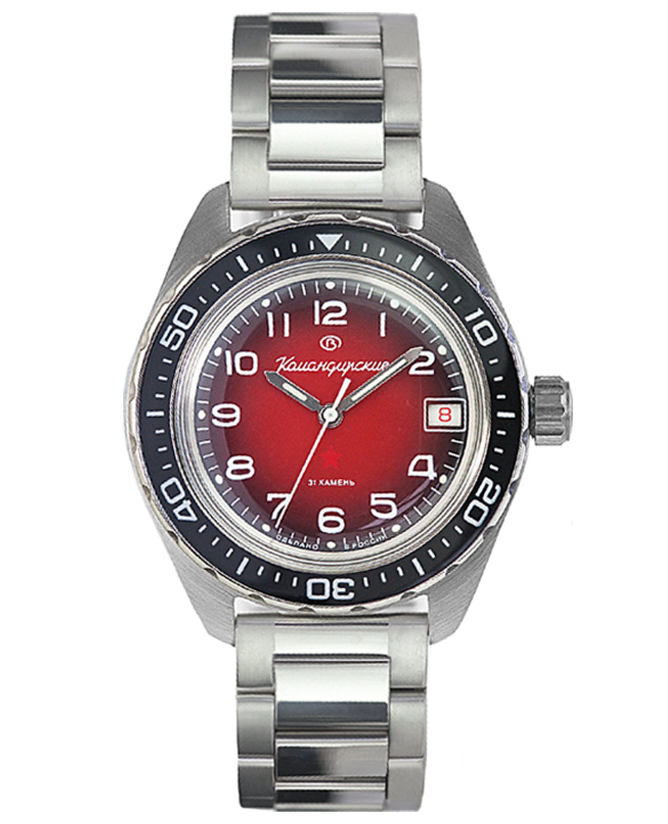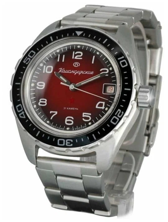 Мужские российские механические наручные часы Восток Командирские 02035А, механический механизм (автоматический калибр) с высокой точностью. Класс водозащиты: 200 метров, позволит плавать, нырять и заниматься другими водными видами спорта. Стрелки с люминесцентным покрытиемЛюминесцентное покрытиеПозволяет считывать показания времени в темноте. Производители наносят на стрелки, часовые индексы, безель или поверхность циферблата светонакопительный состав, дающий холодное свечение.. Вращающийся безельБезельВнешний ободок, закрепляющий стекло. В спортивных часах так называется поворотное кольцо с делениями на циферблате, выполняет роль таймера – замеряет отрезки времени на шкале. Неподвижный безель – элемент декора. Однонаправленно вращающийся безель на дайверских часах позволяет фиксировать моменты погружения и выныривания на поверхность. из нержавеющей стали с PVDPVDУльтратонкое покрытие наносится в технике вакуумного напыления, сочетает в себе нитрид титана особой прочности со слоем золота или оксида хрома. Несёт в себе декоративную или защитную функцию. покрытием. Окошко даты находится в положении 3 часа. Автоподзавод с предохранительным устройством от перезаводки пружины. Частота: 19800 полуколебаний/час. Браслет с раскладной застёжкойРаскладная застёжкаТакой тип застёжки используется только на браслетах из металла. Она никогда не раскрывается полностью, происходит разделение на 2 и более частей. Раскладывающая застёжка снизит вероятность потери часов к минимуму..