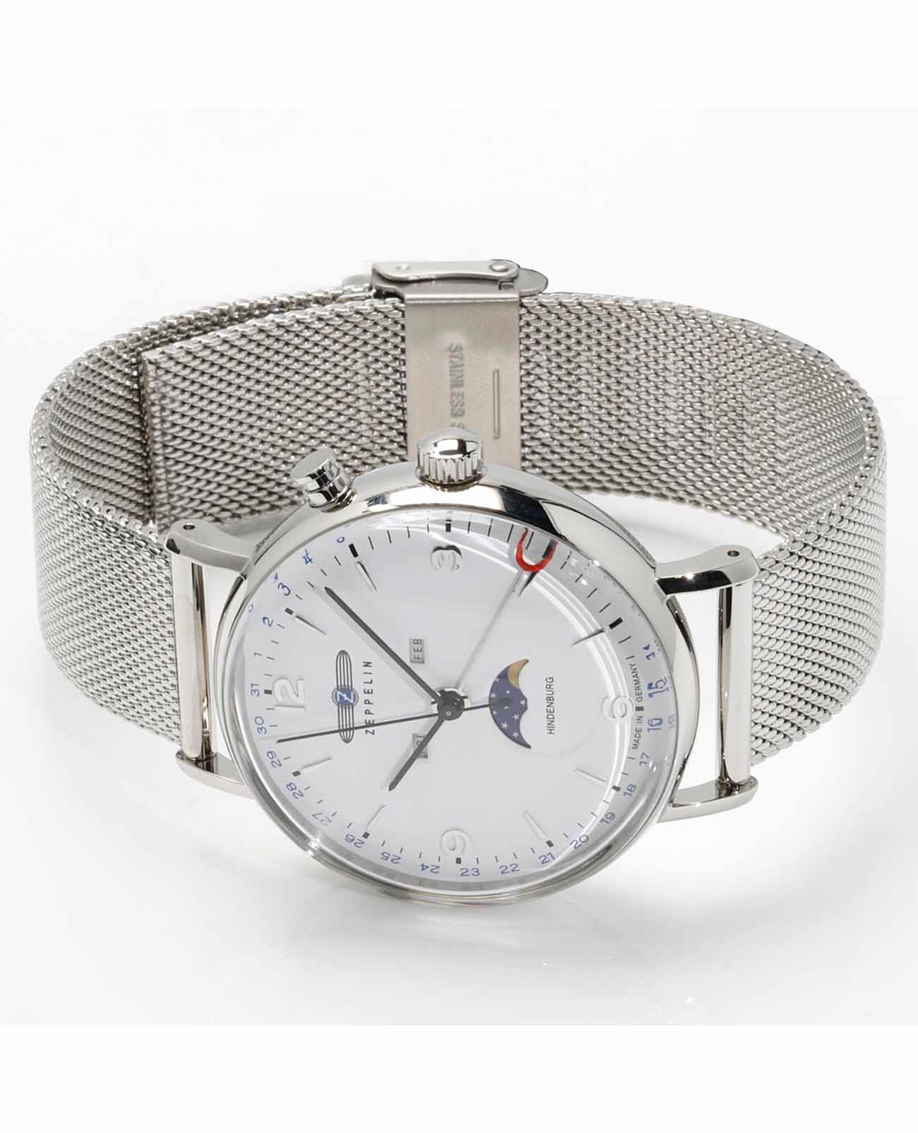 Мужские наручные часы Zeppelin LZ129 Hindenburg 8076М1 сочетают в себе классический дизайн и надежность современных технологий. Модель обладает круглым корпусом, изготовленным из нержавеющей стали без дополнительного покрытия, что обеспечивает высокую устойчивость к внешним воздействиям. Браслет выполнен из стали миланского плетения на раскладном замкеРаскладной замокДанный вариант застежки используется только на часах с металлическим браслетом. Отличительная особенность такого крепления в том, что длина браслета становится универсальной и вы можете самостоятельно отрегулировать нужный вам размер – застежка просто двигается по браслету часов., гарантирующей комфортное ношение и стильный внешний вид. Серебристый циферблат с накладными знаками и оригинальными черными стрелками делает модель особенно привлекательной. Для защиты используется минеральное стеклоМинеральное стеклоМинеральное стекло представляет собой искусственно выращенный минерал кварца. Такое стекло отличается особой устойчивостью к повреждениям и царапинам. Уступает по некоторым качествам сапфировому стеклу., обеспечивающее прочную защиту от царапин. Часы работают на кварцевом механизме, что гарантирует точное время без необходимости подзаводки. Водонепроницаемость часов достигает 5 атмосфер (50 метров), что позволяет использовать их во время плавания на поверхности, однако не рекомендуется для глубоководного дайвинга или занятий водными видами спорта с высоким уровнем активности.